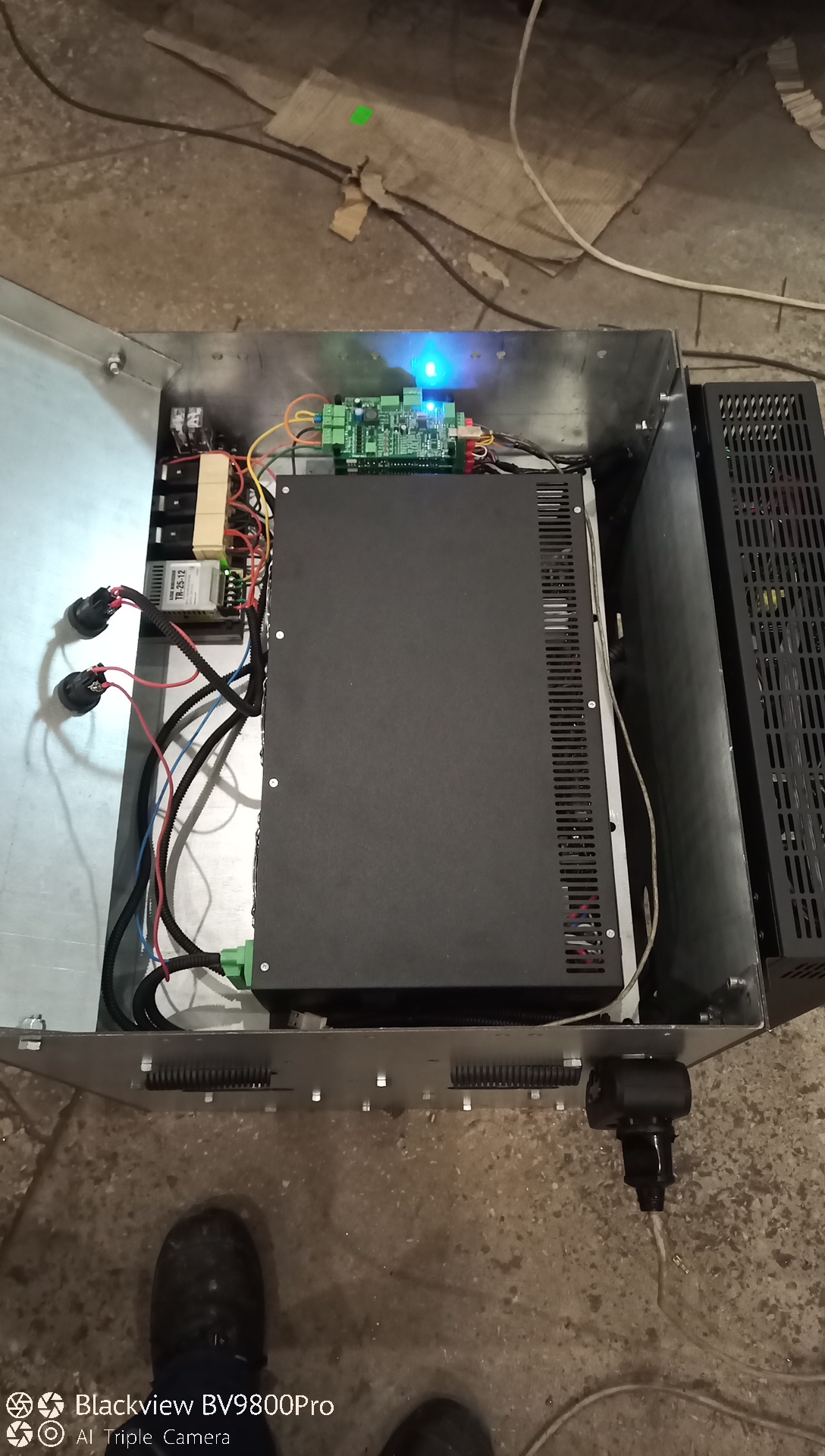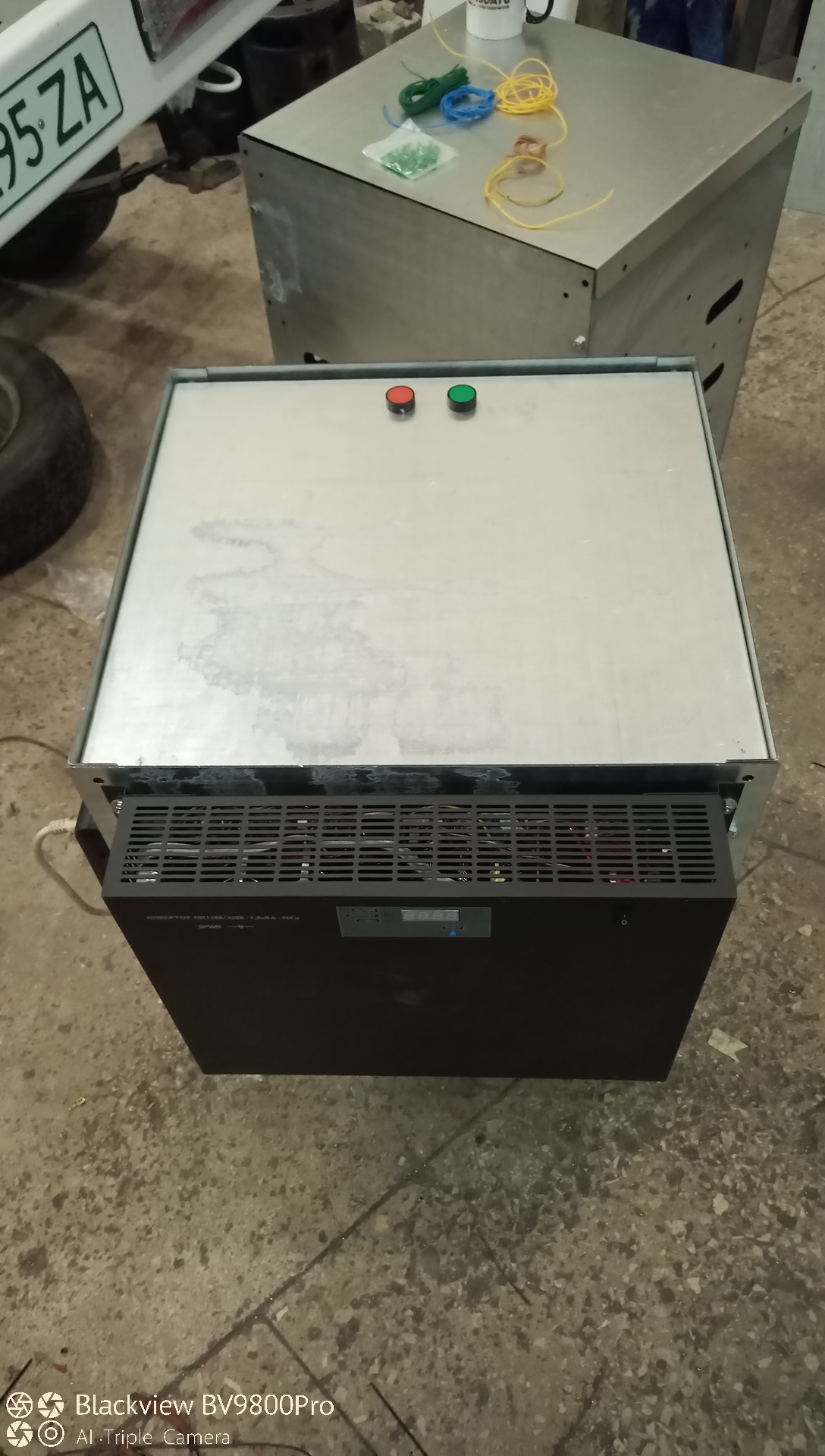 Зібрав систему безперебійного живлення 220 В, на основі батарейних модулів Chevrolet Bolt. Батарея зібрана з троьх модулів 3p10s, з'єднаних послідовно. Загальна напруга у діапазоні 99...124,5 В (3,30...4,15 на комірках), ємність 17 кВтг. Система побудована як онлайновий безперебійник, тобто при зникненні напруги у мережі система продовжує працювати на навантаження, без розриву потужності. Вихід змінної напруги забезпечує інвертор 110/220 3kVA, чистий синус. Зарядний пристрій від мережі видає 20А зарядного струму. Керування системою побудовано на БМС від Романтика і декількох реле. Для живлення БМС використовується невеликий БП для світлодіодів 110В/12В. Корпус зібраний на болтах М6, зі сталевих оцинкованих панелей 2мм, порізаних лазером і зігнутих на ЧПУ. Загальна вага вийшла біля 100 кг, тому для переміщення по підлозі була виготовлена підставка на колесах.