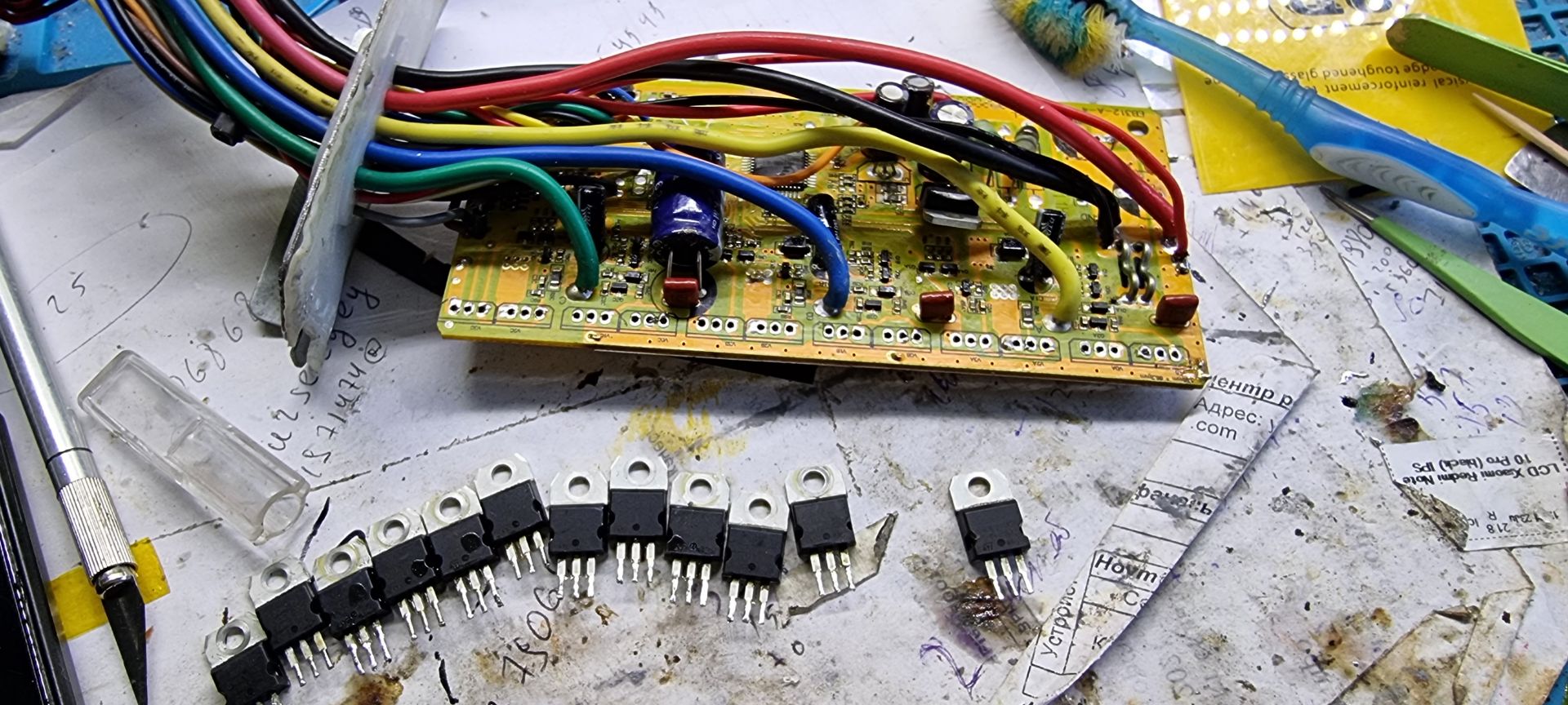 Всех неравнодушных,приветствую.История такая.Решил я свой набор переставить на другой вел,всю электрическую часть я сделал,а МК отдал переспицевать и вот в момент истины,когда подключаешь и думаешь что уже поедешь,услышал где-то замыкание и запах горелого.Оказалось,что мастер по спицовке замкнул мне провода с оси МК,я разобрал все провода заново перепаял,все подключил,мотор заработал,но плохо,то дергался,то ехал с посторонними звуками,но помучавшись с фазами МК и холла(самообуча нет),я добился оптимального результата.Проблема в лишнем свисте и потере мощности МК.Как я только не мучался с фазами,результата такого как был раньше у меня не получилось.Далее я заказал новый контроллер,подключил и все работает хорошо.Но хотелось бы сделать старый прозапас себе или маме велик сделать еще один.Прошу помощи,подскажите пожалуйста в чем может быть проблема в контроллере?Я его разобрал,выпаял мосфеты все ST 80nf70,прозвонил,отличий в показаниях мультиметра нет между ножками на всех мосфетах,5в везде так же есть,заказал еще все новые кондеры,думаю поменять,где-то слышал,что в них может быть проблема.Может кто сталкивался с подобным и подскажет,буду признателен,спасибо.