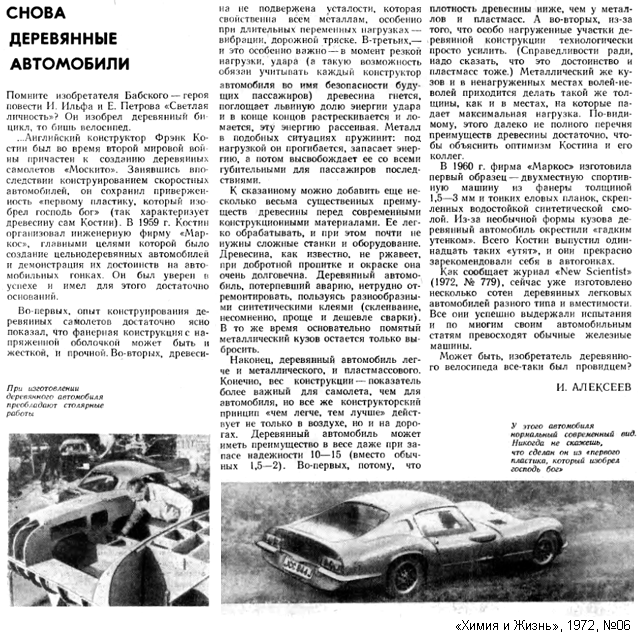 «Химия и Жизнь», 1972, №06 И.Алексеев. СНОВА ДЕРЕВЯННЫЕ АВТОМОБИЛИ Помните изобретателя Бабского — героя повести И. Ильфа и Е. Петрова «Светлая личность»? Он изобрел деревянный бицикл, то бишь велосипед. ...Английский конструктор Фрэнк Костин был во время второй мировой войны причастен к созданию деревянных самолетов «Москито». Занявшись впоследствии конструированием скоростных автомобилей, он сохранил приверженность «первому пластику, который изобрел господь бог» (так характеризует древесину сам Костин). В 1959 г. Костин организовал инженерную фирму «Маркос», главными целями которой было создание цельнодеревянпых автомобилей и демонстрация их достоинств на автомобильных гонках. Он был уверен в успехе и имел для этого достаточно оснований. Во-первых, опыт конструирования деревянных самолетов достаточно ясно показал, что фанерная конструкция с напряженной оболочкой может быть и жесткой, и прочной. Во-вторых, древесина не подвержена усталости, которая свойственна всем металлам, особенно при длительных переменных нагрузках — вибрации, дорожной тряске. В-третьих, — и это особенно важно — в момент резкой нагрузки, удара (а такую возможность обязан учитывать каждый конструктор автомобиля во имя безопасности будущих пассажиров) древесина гнется, поглощает львиную долю энергии удара и в конце концов растрескивается и ломается, эту энергию рассеивая. Металл в подобных ситуациях пружинит: под нагрузкой он прогибается, запасает энергию, а потом высвобождает ее со всеми губительными для пассажиров последствиями. К сказанному можно добавить еще несколько весьма существенных преимуществ древесины перед современными конструкционными материалами. Ее легко обрабатывать, и при этом почти не нужны сложные станки и оборудование. Древесина, как известно, не ржавеет, при добротной пропитке и окраске она очень долговечна. Деревянный автомобиль, потерпевший аварию, нетрудно отремонтировать, пользуясь разнообразными синтетическими клеями (склеивание, несомненно, проще и дешевле сварки). В то же время основательно помятый металлический кузов остается только выбросить. Наконец, деревянный автомобиль легче и металлического, и пластмассового. Конечно, вес конструкции — показатель более важный для самолета, чем для автомобиля, но все же конструкторский принцип «чем легче, тем лучше» действует не только в воздухе, но и на дорогах. Деревянный автомобиль может иметь преимущество в весе даже при запасе надежности 10 — 15 (вместо обычных 1,5—2). Во-первых, потому, что плотность древесины ниже, чем у металлов и пластмасс. А во-вторых, из-за того, что особо нагруженные участки деревянной конструкции технологически просто усилить. (Справедливости ради, надо сказать, что это достоинство и пластмасс тоже.) Металлический же кузов и в ненагруженных местах волей-неволей приходится делать такой же толщины, как и в местах, на которые падает максимальная нагрузка. По-видимому, этого далеко не полного перечня преимуществ древесины достаточно, чтобы объяснить оптимизм Костина и его коллег. В 1960 г. фирма «Маркое» изготовила первый образец — двухместную спортивную машину из фанеры толщиной 1,5 — 3 мм и тонких еловых планок, скрепленных водостойкой синтетической смолой. Из-за необычной формы кузова деревянный автомобиль окрестили «гадким утенком». Всего Костин в