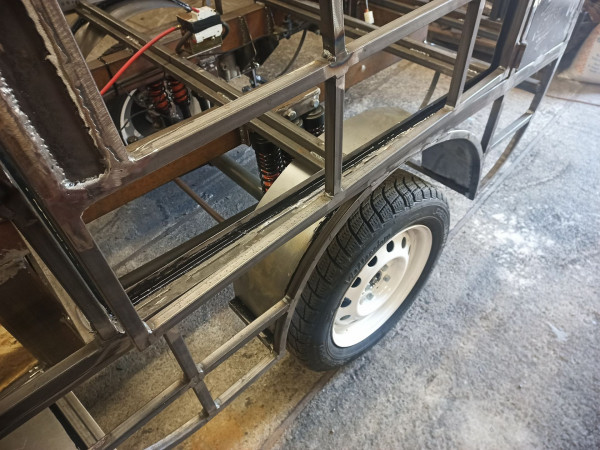 Сегодня были изготовлены и установлены подкрылки на передние колеса. Это была последняя деталь металлического каркаса машины, сварочные работы закончены, приступили к обработке герметиком.