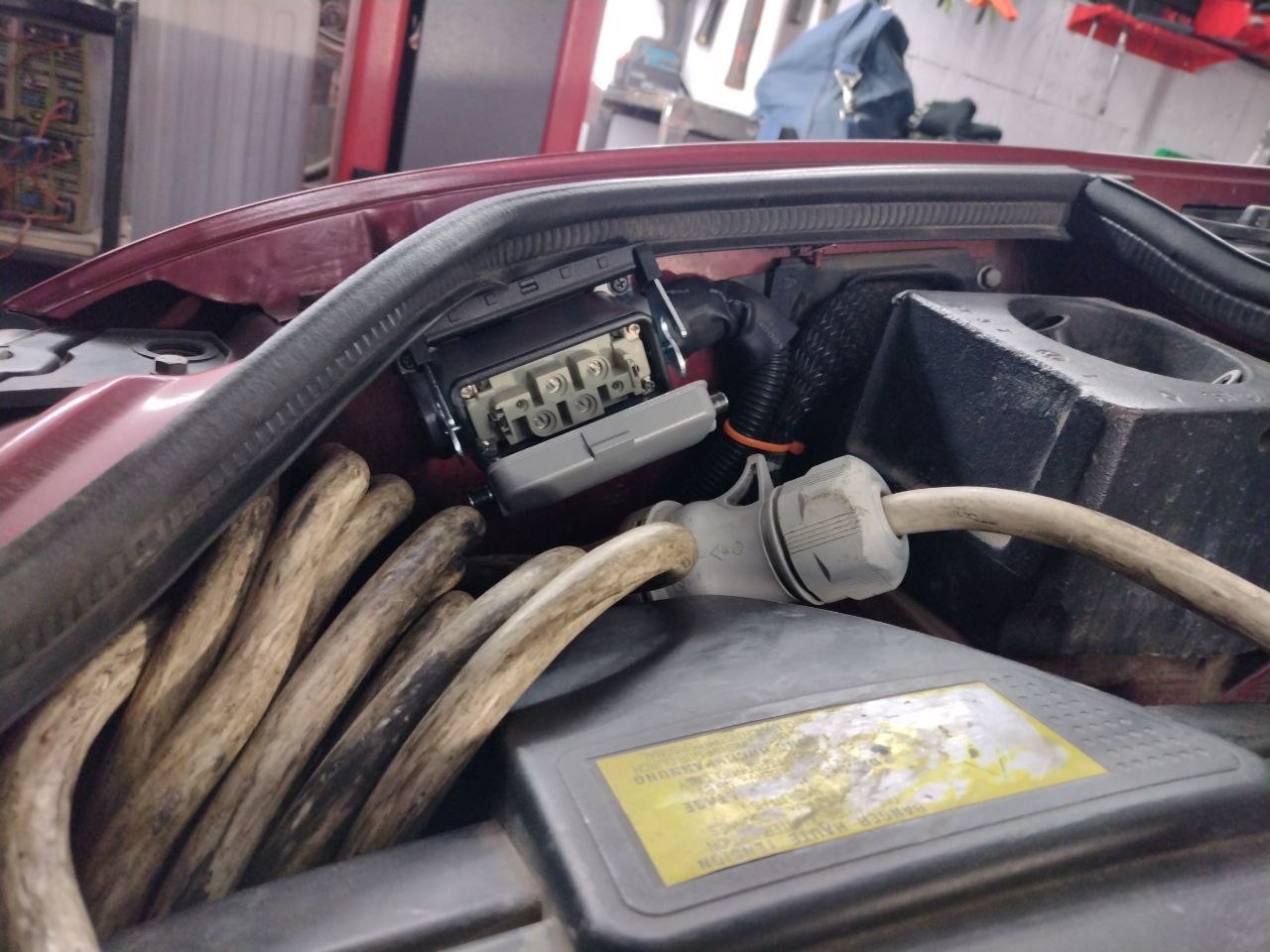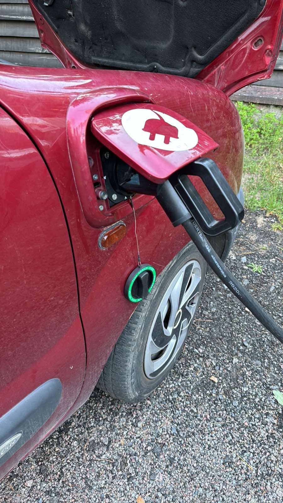 З авта прибрали однофазну зарядку і врізали в штатний лючок Type-2 розетку. По одній фазі зарядка також буде відбуватись, але у нас ніхто до однофазної зарядки більше не під‘їде, бо у цієї автівки власна "зарядна станція" на три фази у вигляді брендової коробочки від екофактор, яка встановлена у нас на території без підключення до білінга.