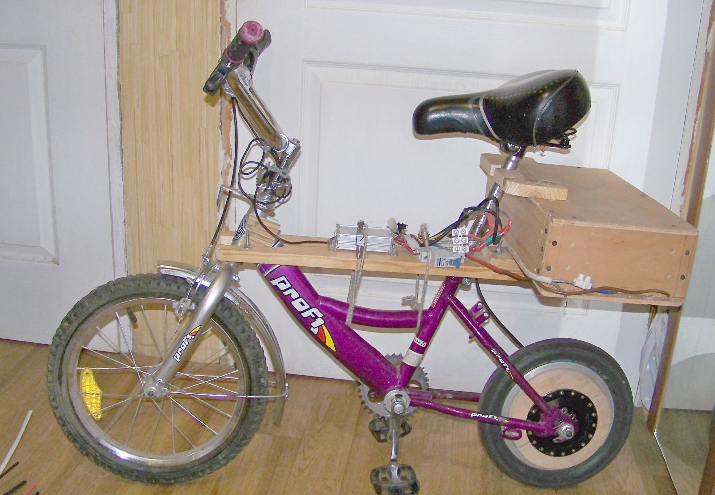 Зробив електровел із дитячого велосипеда з колесами переднє 16", заднє 12" з редукторним мотором 360 ват. Акумулятор ліфер 48 вольт 20 а-год, вага акума 12 кг. При різкому старті вел намагається стати дибки. Акумулятор потрібно буде перенести вперед. Але в ідеалі потрібно збільшити базу-відстань між колесами.