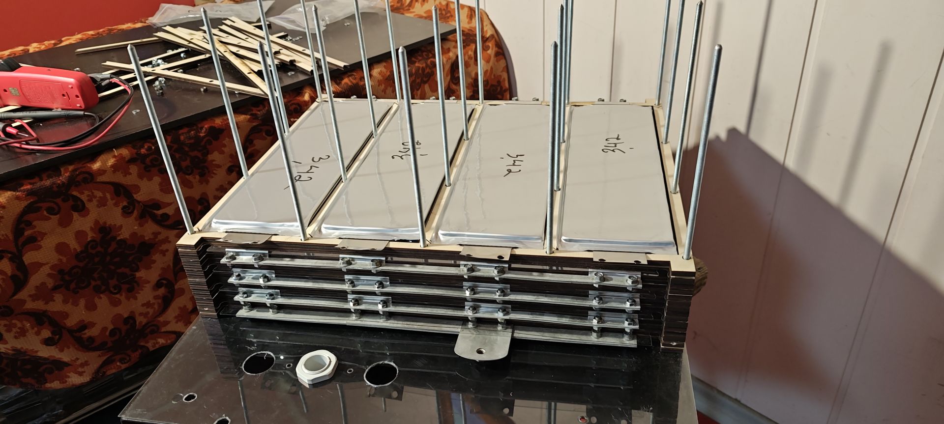 У корпус блока вдалося розмістити 84 пакети SK 60 Аh, по схемі 21s4p, що дає приблизно 19-19.5 кВтг ємності. BMS Ant 21-30s 400A(1000A 10s). Зарядні пристрої 2*25А/87.15V. Двигун асинхронний, 7,5/15 кВт, контролер DALA A5. Для закріплення блоку під капотом виготовлена рама з профільних труб 40*20, 40*40. Це перший мій проєкт без використання б.в. компонентів. Усі деталі куплені нові, або виготовлені на замовлення за моїми кресленнями.