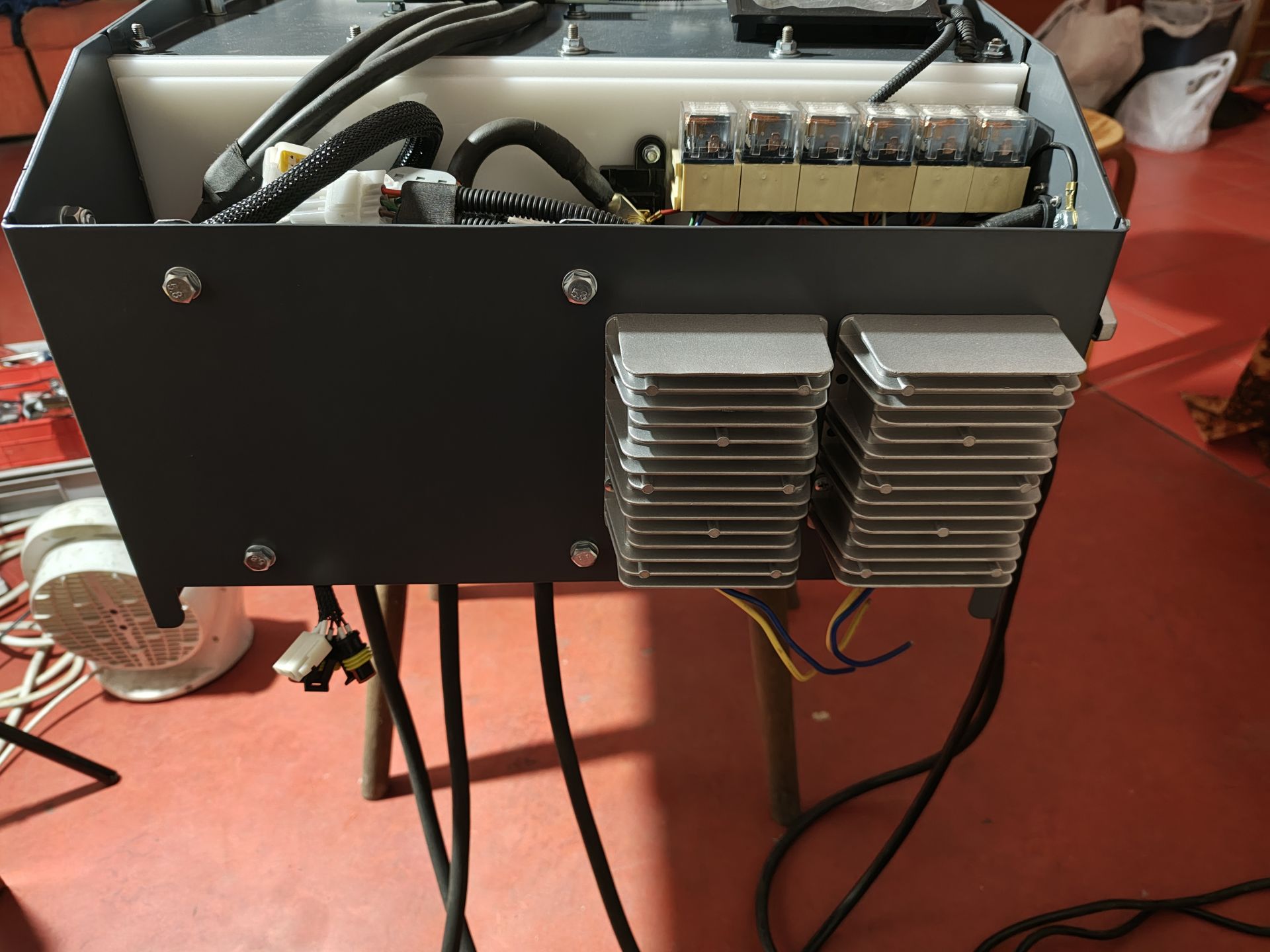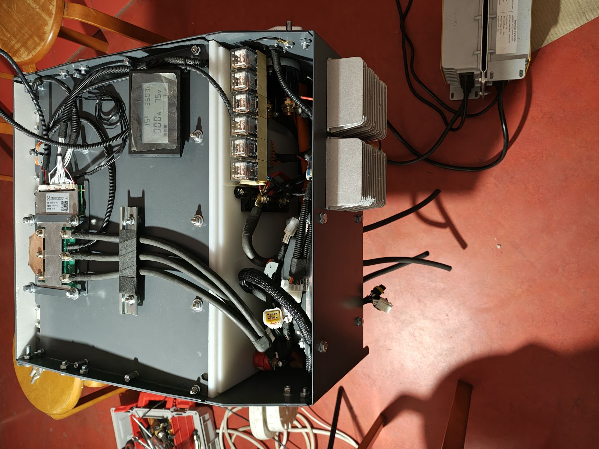 Зарядні пристрої винесені за межі підкапотного блоку. В цьому проекті я не використовую телеком блоки. Замість них будуть два ЗУ у герметичних корпусах на місці штатної батареї 12В. Батареї 12В не буде зовсім. Живлення бортових систем забезпечать пара паралельних герметичних dcdc 13.8V 30A. Інститут погодив таке технічне рішення. Вага підкапотного блоку разом з зарядними пристроями і двигуном на 20 кг перевищує сумарну вагу знятих з переду агрегатів . Конструкція блоку виконана з листового металу 2мм. Деталі виготовлені методом ЧПУ-лазерної різки/згину, пофарбовані порошком.