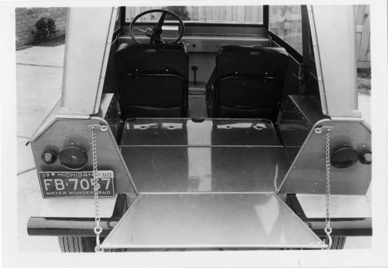 Двухместный пассажирский салон трудно, пожалуй, назвать достаточно комфортабельным. Для входа-выхода служит откидывающийся вперед и вверх прозрачный «фонарь», — решение экзотичное, но не самое оптимальное. Чтобы облегчить посадку и высадку (водитель и пассажир находятся в полулежачем положении), рулевая колонка сделана поворотной в боковом направлении и имеет оригинальное запорное устройство. Удобное расположение контрольных приборов и органов управления позволяет свободно управлять автомобилем. Причем это относится и к людям высокого роста.