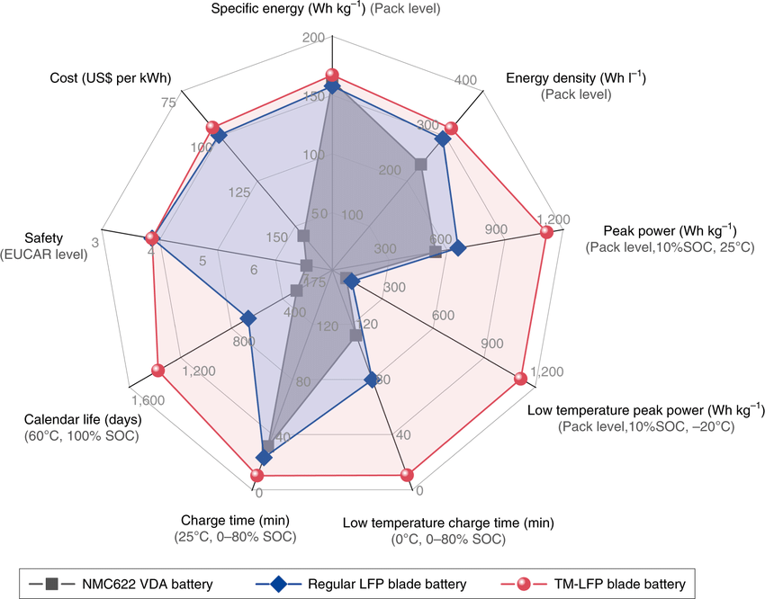 Аккумуляторная батарея TM LFP blade соответствует всем основным критериям, требуемым для массовых электромобилей. Сравнение аккумуляторной батареи TM-LFP blade (красная), обычной аккумуляторной батареи LFP blade (синяя) и призматической батареи NMC622 (серая, стандарт VDA-BEV2) при различных критериях производительности. Емкость ячеек составляет 3 мАч см–² (дополнительная таблица 2). Удельная энергия и мощность находятся на уровне пакета, предполагая, что GCTP составляет 0,65 для батареи NMC622, 0,85 для обычной аккумуляторной батареи LFP blade и 0,9 для аккумуляторной батареи TM-LFP blade (с упрощенной системой терморегулирования). Температуры на этом рисунке относятся к температурам окружающей среды. Аккумуляторная батарея TM-LFP относится к ячейке с радиусом графита в 1,5 раза больше. Точки данных взяты из рис. 2b для удельной энергии, рис. 2d для плотности энергии, дополнительные рисунки. 5f и 14b для пиковой мощности, рис. 4 и дополнительный рис. 14d для времени зарядки и рис. 5d для календарного срока службы. Данные по безопасности основаны на уровнях безопасности EUCAR, определенных в ссылке ³². Стоимость батареи основана на ссылке ³ для батареи NMC и ссылке ²⁴ для батареи LFP, а батарея TM-LFP может дополнительно снизить стоимость за счет упрощения системы терморегулирования батареи (~250 долларов США для аккумуляторной батареи емкостью 60 кВт·ч⁴⁰).