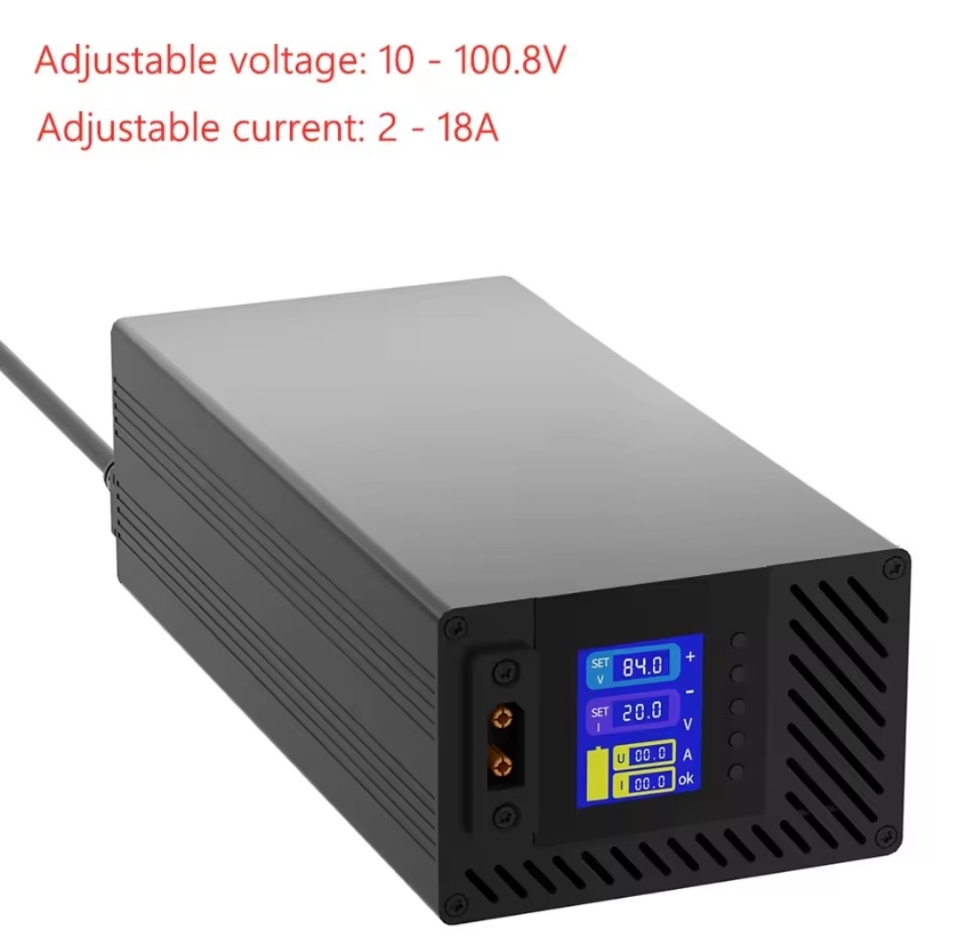 Купив я китайський зарядний пристрій для заряджання мого літій-іонного акумулятора. Зарядний пристрій дає можливість регулювати напругу (від 10 до 100,8 вольт) та силу струму (від 2 до 18 ампер).