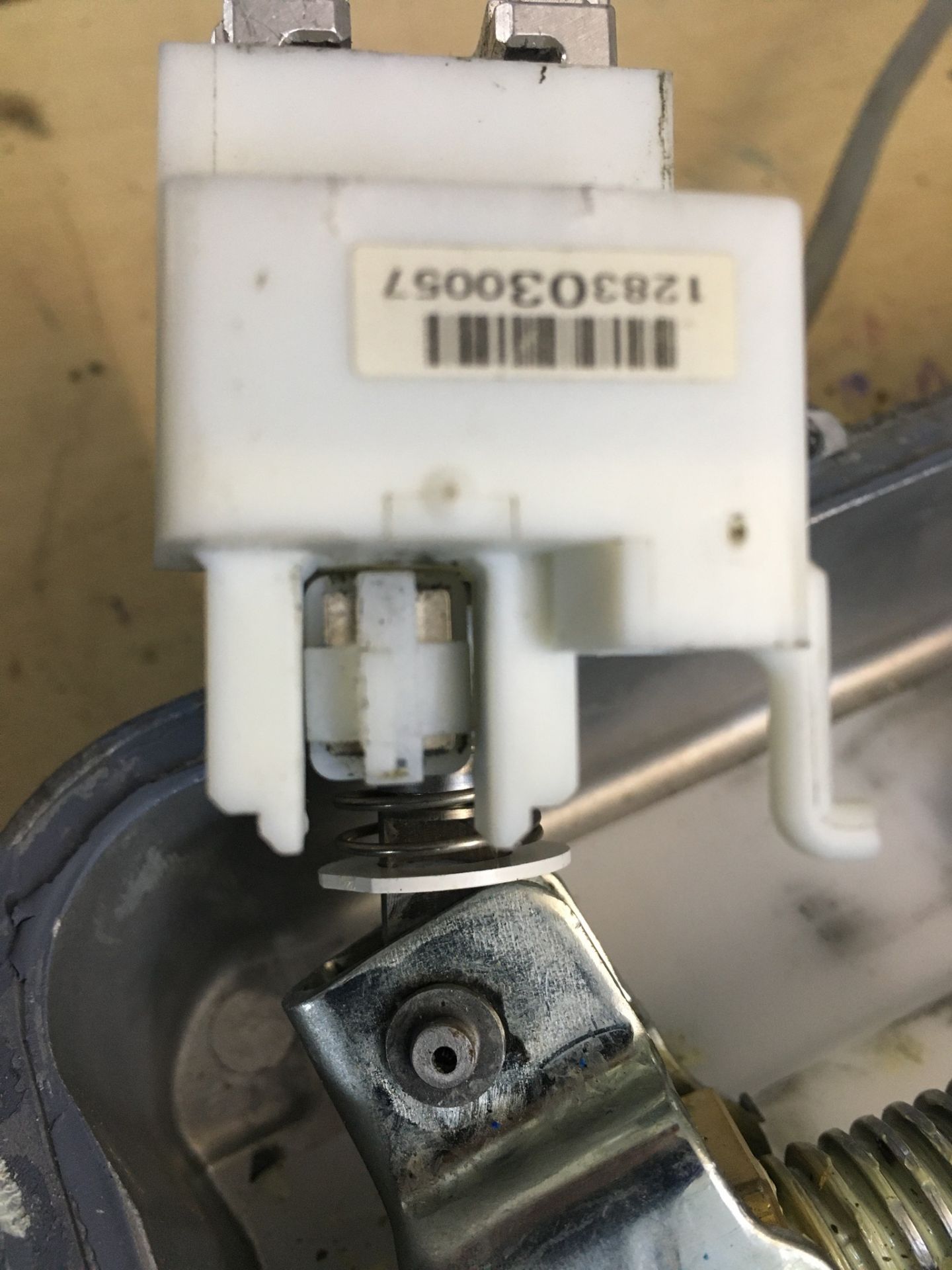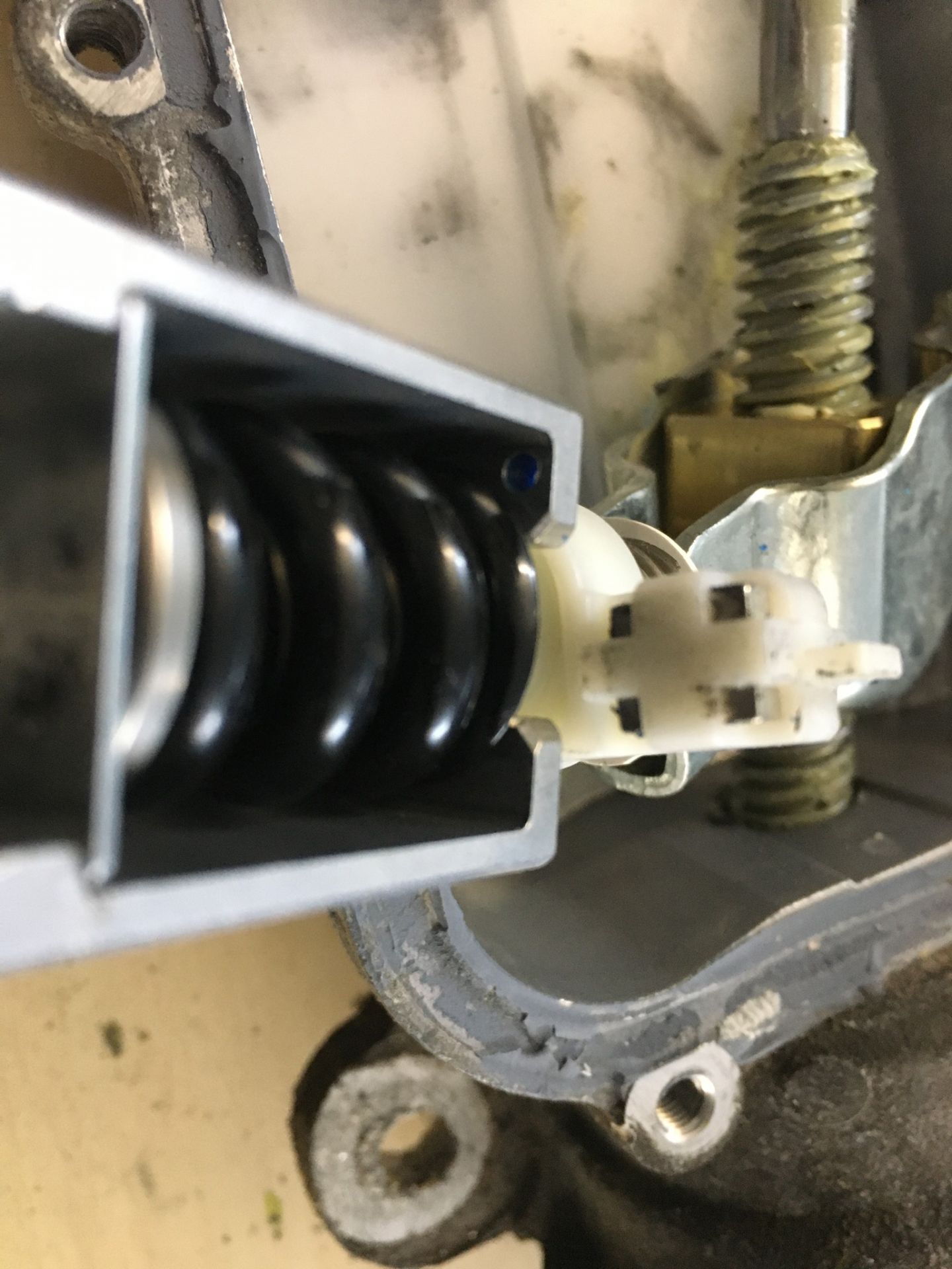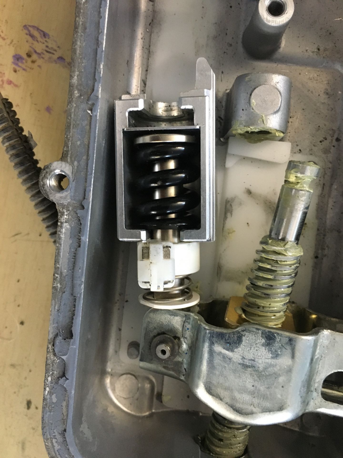 Кроме того «вскрытие подтвердило» механический алгоритм работы, который я предположил ранее. То есть перемещение каретки с гайкой приводило к сжатию пружины и перемещению поводка с магнитом, связанного со штоком (внутри пружины). Перемещаясь, магнит соответственно воздействовал на два датчика холла, расположенных вот в тех «белых рожках» пластикового корпуса