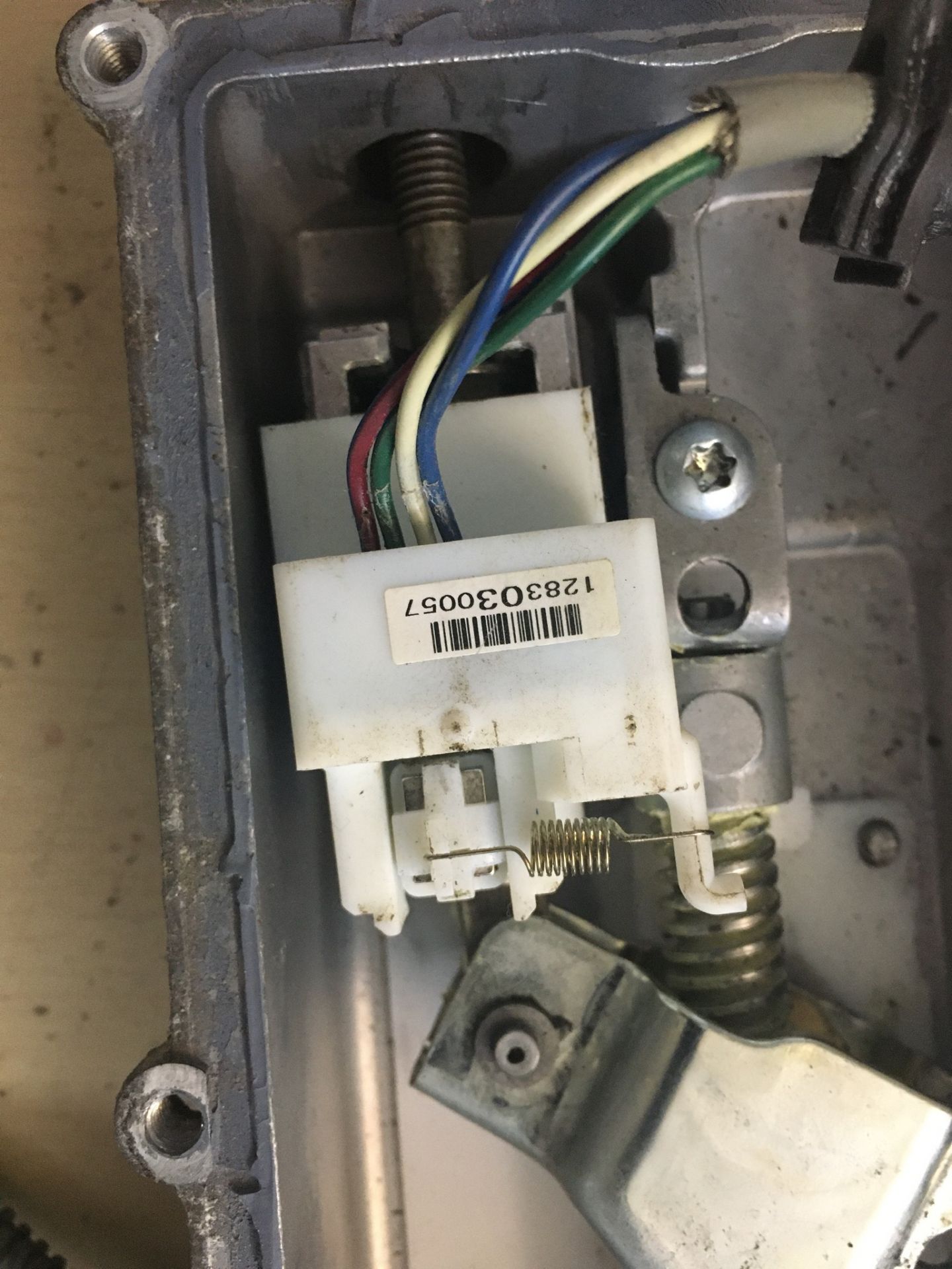 Кроме того «вскрытие подтвердило» механический алгоритм работы, который я предположил ранее. То есть перемещение каретки с гайкой приводило к сжатию пружины и перемещению поводка с магнитом, связанного со штоком (внутри пружины). Перемещаясь, магнит соответственно воздействовал на два датчика холла, расположенных вот в тех «белых рожках» пластикового корпуса