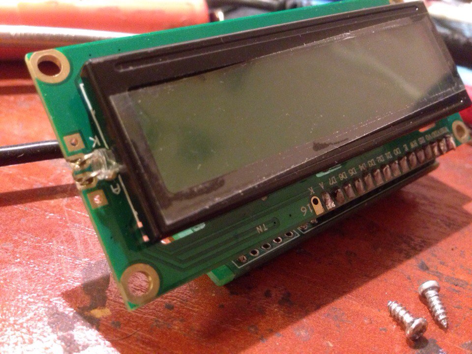 В схеме используется самый простой ЖКИ без подсветки, я не стал ничего изобретать и менять ЖКИ (в ближайшем будущем обязательно заменю на нормальный, возможно даже OLED) - просто засунул один белый светодиод сбоку ЖКИ и подпаялся через резистор на 22 (Ом) к выводам питания.