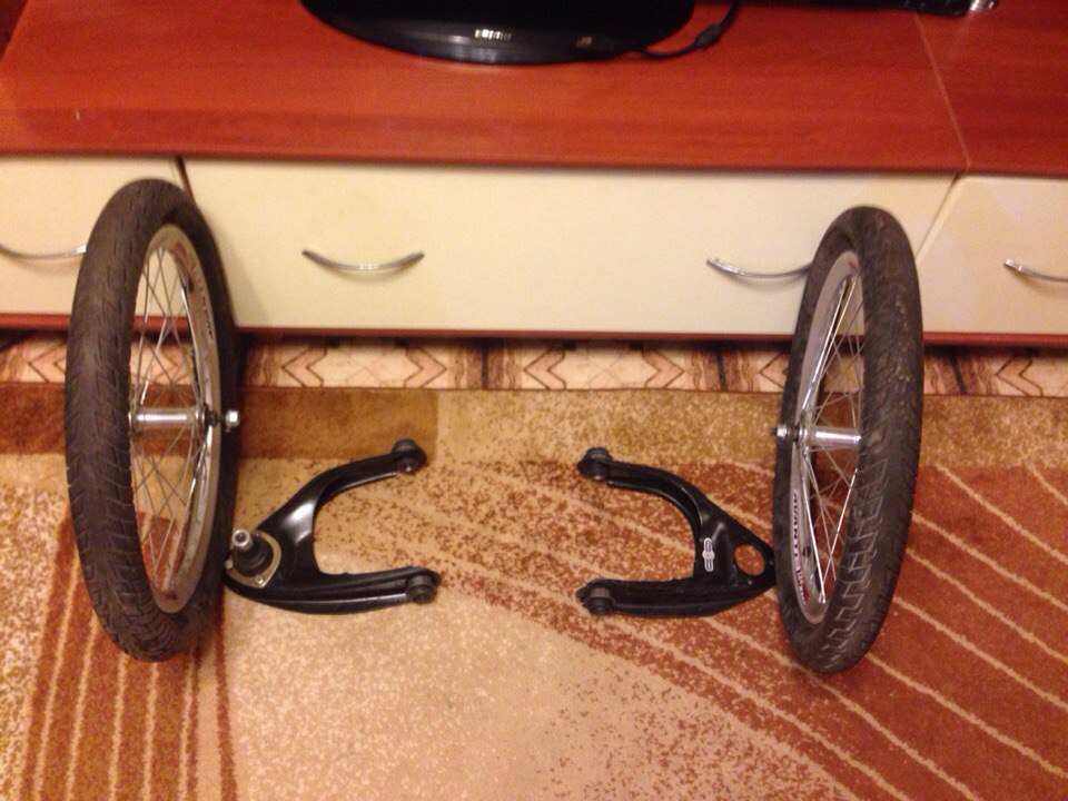 Взял рычаги от ВАЗа, чисто для примерки - по моему то, что нужно. Они не тяжелые, прочные и эстетически выглядят красиво, завтра возьму цапфу жигулевскую, и займусь креплением колес..