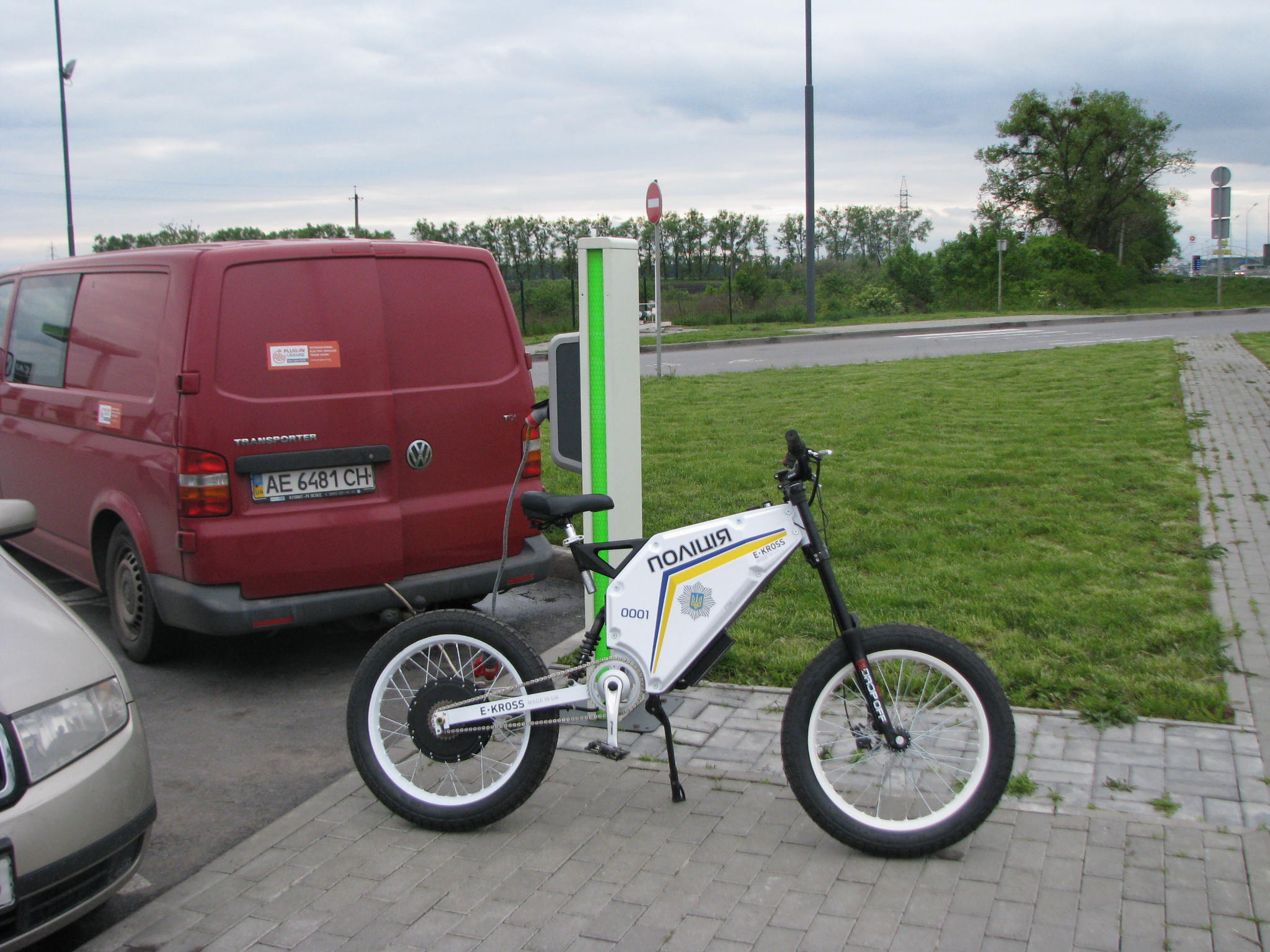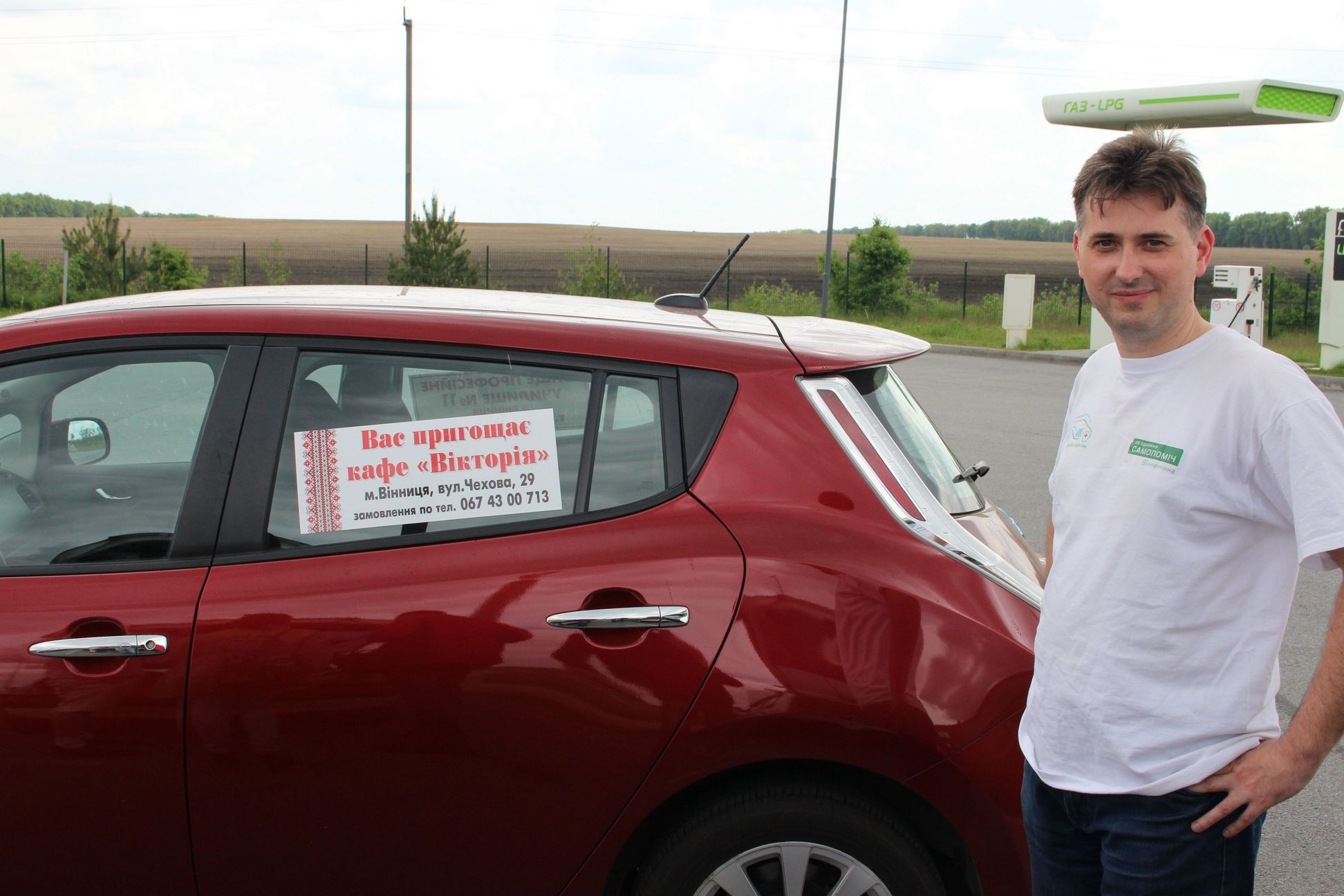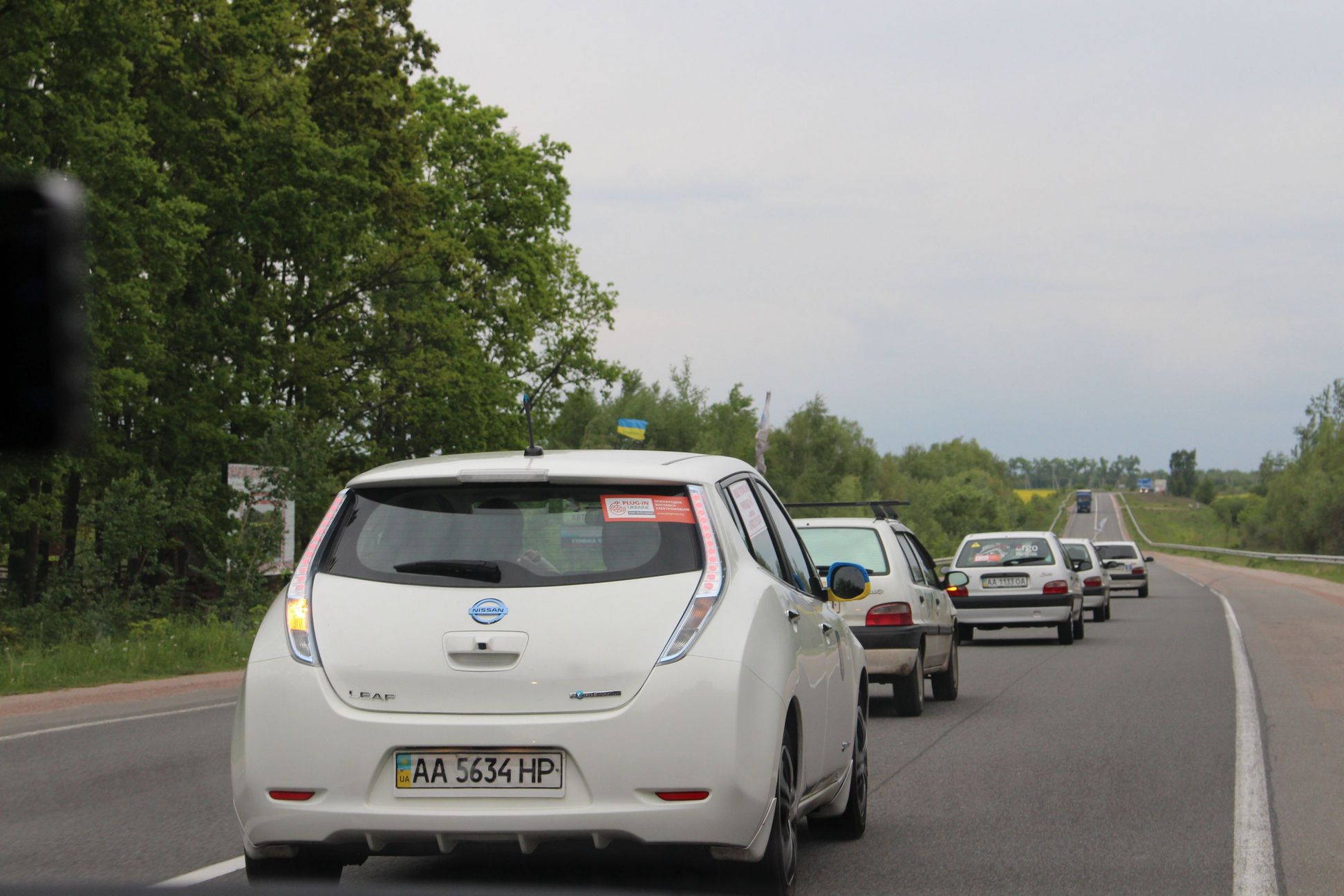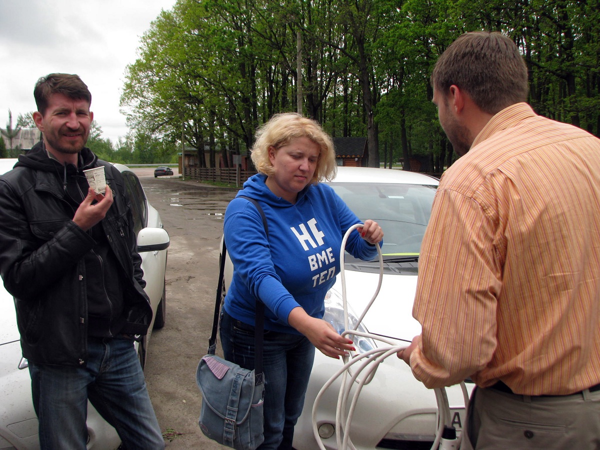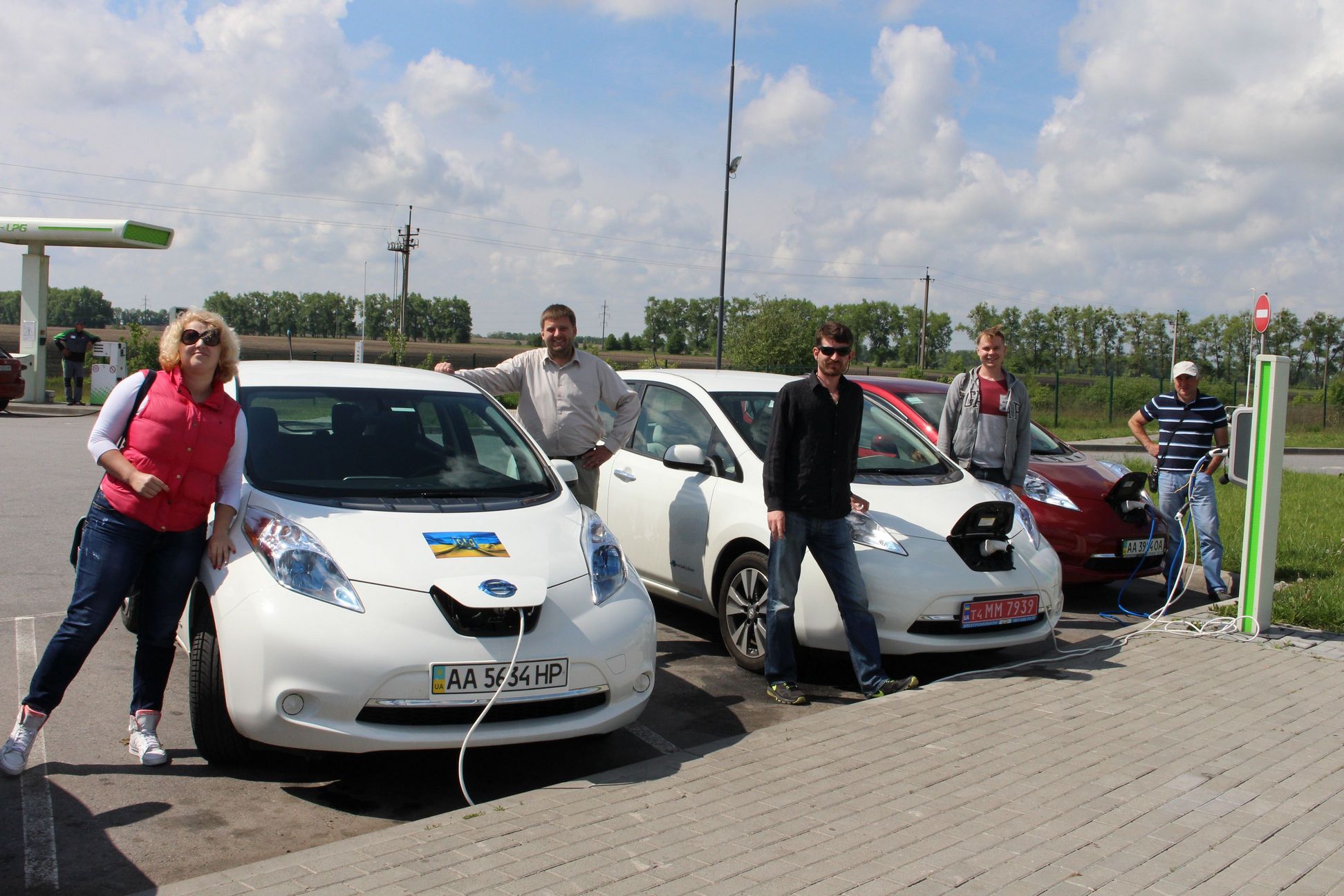 15-30 Приехали в Левков. Четыре Сакса стали на зарядку. Ещё один Лиф подключился к розетке на самом здании заправки ОККО. Для Фольксфагена Комби мощности не хватило. Он поедет следующий участок на дизеле. Остальные Лифы поехали на Киев. Возможно они чуть-чуть подзарядятся в Калиновке.