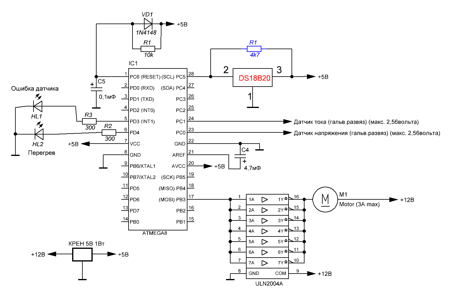 Кстати, схема работает и без подключения датчиков тока и напряжения. В этом случае она регулирует обороты вентилятора в зависимости от температуры.