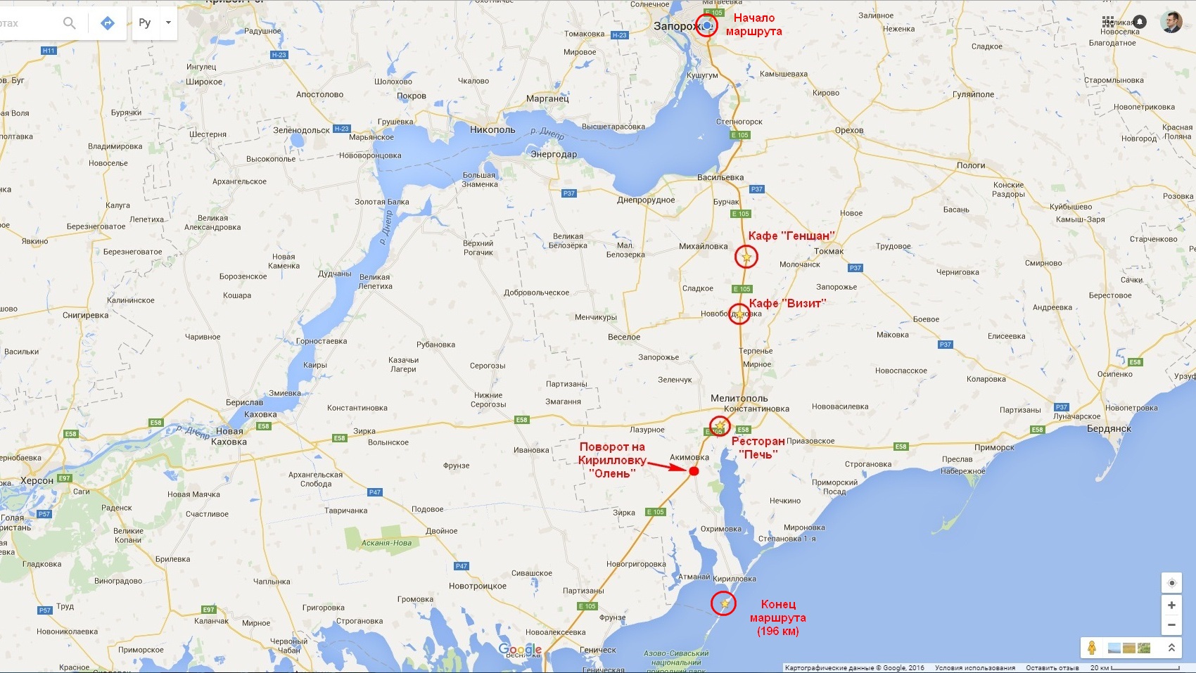 28.06.2016 я осуществил очередную поездку, на этот раз по маршруту в сторону Азовского моря: Запорожье-Васильевка-Мелитополь-Кирилловка. Протяженность этого маршрута от моего дома до конца Федотовой косы (Степок) составила 196 км. Основное внимание я уделил участку в районе Мелитополя, т.к. это почти середина этого маршрута. В результате, мне удалось провести переговоры с владельцами/директорами трех придорожных кафе/ресторанов. Заполнил анкеты, снял координаты мест, сделал много фото. Вот отметки на карте, где расположены эти заведения. Ниже, отдельными постами я выложу детальную информацию о каждом заведении и их фотографии.
