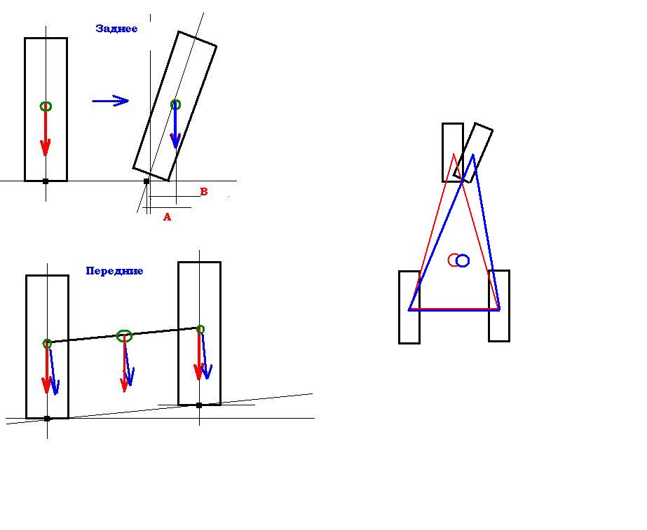 внешнее к повороту колесо "оттягивается" немного назад,а внутреннее - вперёд, соответственно меняется форма условного треугольника колёс - от условно равнобедренного он стремится к равностороннему и результирующая центробежных сил "направляется" к внешнему колесу и немного ниже ,т.е. опора в виде этого внешнего колеса располагается дальше той точки в которую направлен вышеуказ. вектор. (блин,как-же сложно для меня словами описывать эту модель - на листике-бы,да с карандашиком). Вот эта кинематика в купе с НЕБОЛЬШИМ поворотом заднего колеса и обеспечивает манёвренность и ОТНОСИТЕЛЬНУЮ устойчивость аппарата. И профиль колёс неспроста выбран "мотоциклетный", потому как работать должен большой сектор (полукруг) колеса при наклонах. Кстати на первом Страйке в задней подвеске тоже правильнее было-бы использовать широкую шину с полукруглым профилем,потому как задний рычаг не компенсирует наклон кузова в поворотах в отличии от рычажной передней, и соответственно пятно контакта задних колёс не оптимально.