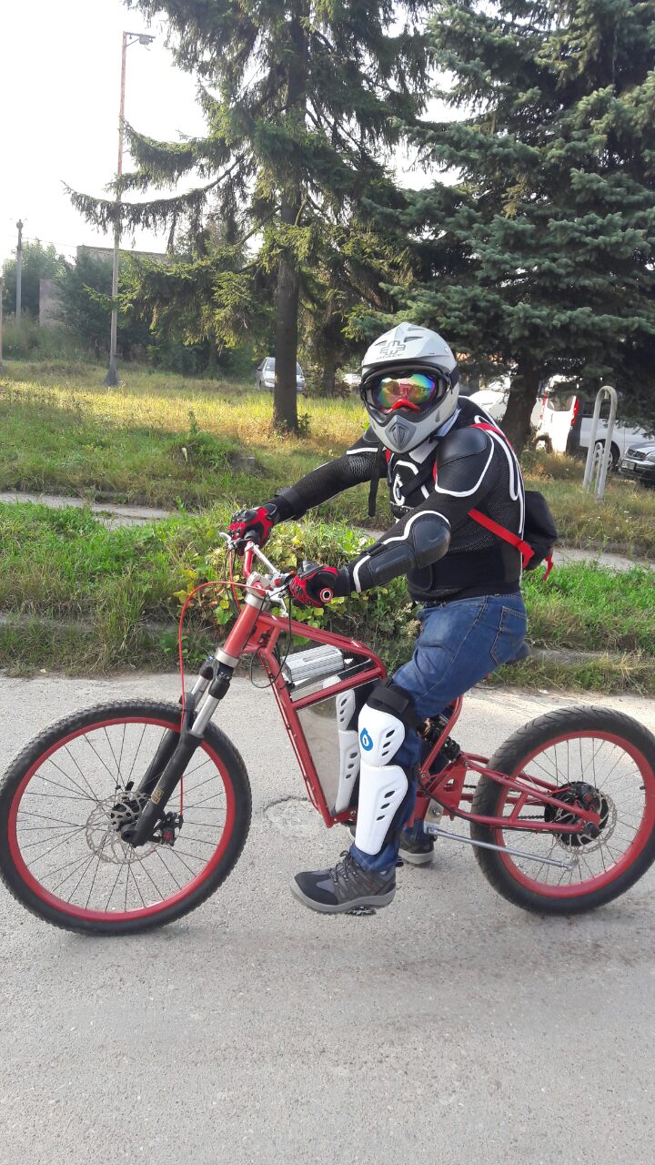 Бай зібраний повністю і я розпочав активне тестування. Щодня по виробничих питаннях накатую по 60-80 км в активному режимі. Максималка по плоскачу виходить до 60 км/год.Акумулятор 20S1R ЛіПо, 72В 18А/год.Двигун МАС10.