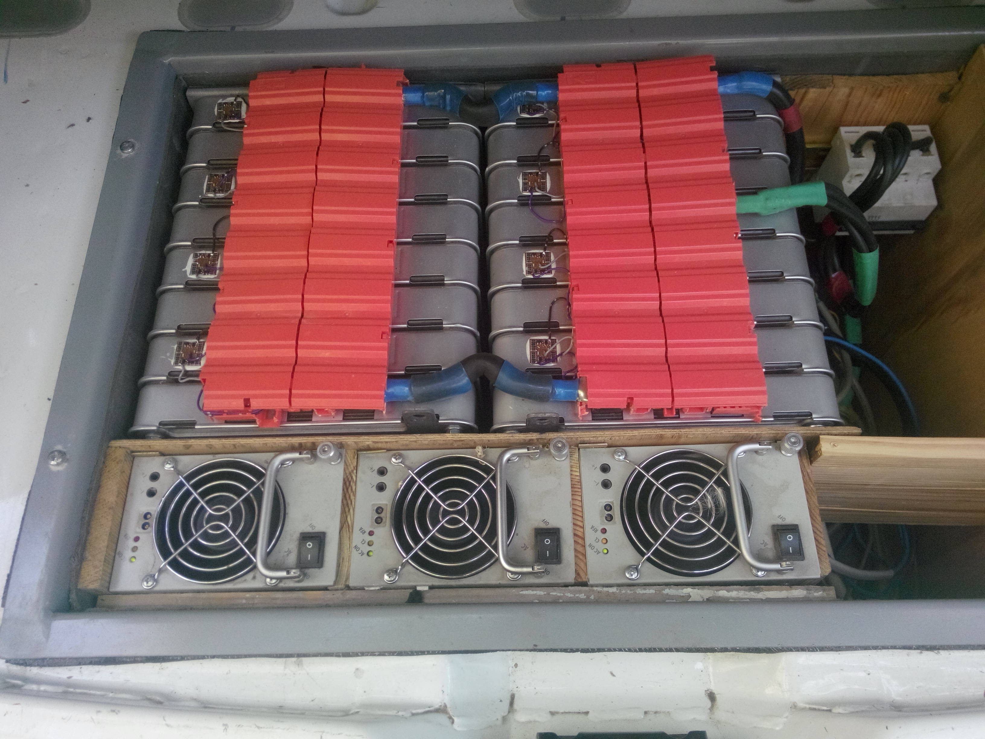 Вот и дошли руки втулить еще половинку батареи, балансиры чуток переделал и переместил на корпус, на клемах они плохо себя показали, из-за смены температуры контакт на соединениях разбалтывался, ну выглядит примерно так...