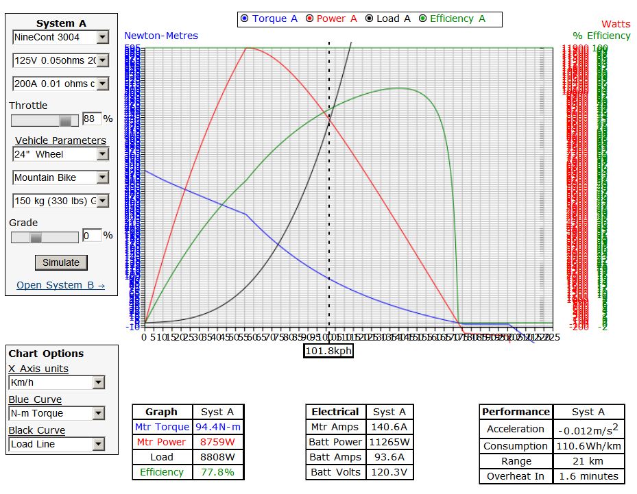 Поскольку крошки в базе моторов калькулятора нет (раньше была, а сейчас реально мощных моторов там нет), то возьмем самый мощный велосипедный по моему разумению, напряжение пришлось поднять чтобы согласовать обороты для достижения 100км/ч.