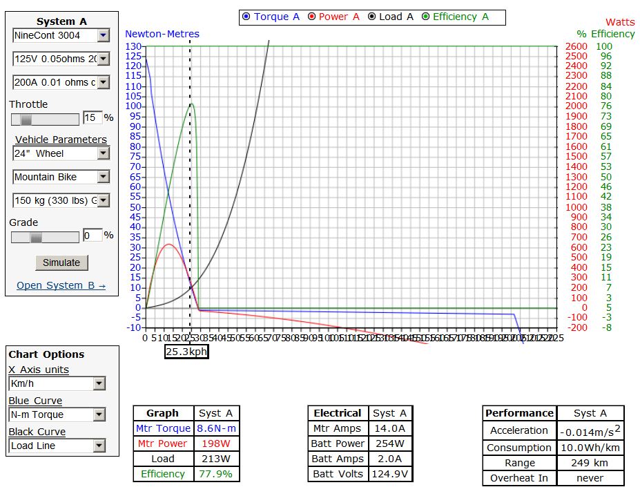 http://electroavtosam.com.ua/forums/download/file.php?mode=view&id=5922Как видим этот дрыщ дает больше сотни с КПД 77.8% (долго он так конечно не сможет, без принудительного охлаждения его безопасный сколь угодно длительный предел по скорости всего 55км/ч). А теперь давайте посмотрим КПД и расход на 25кмч.
