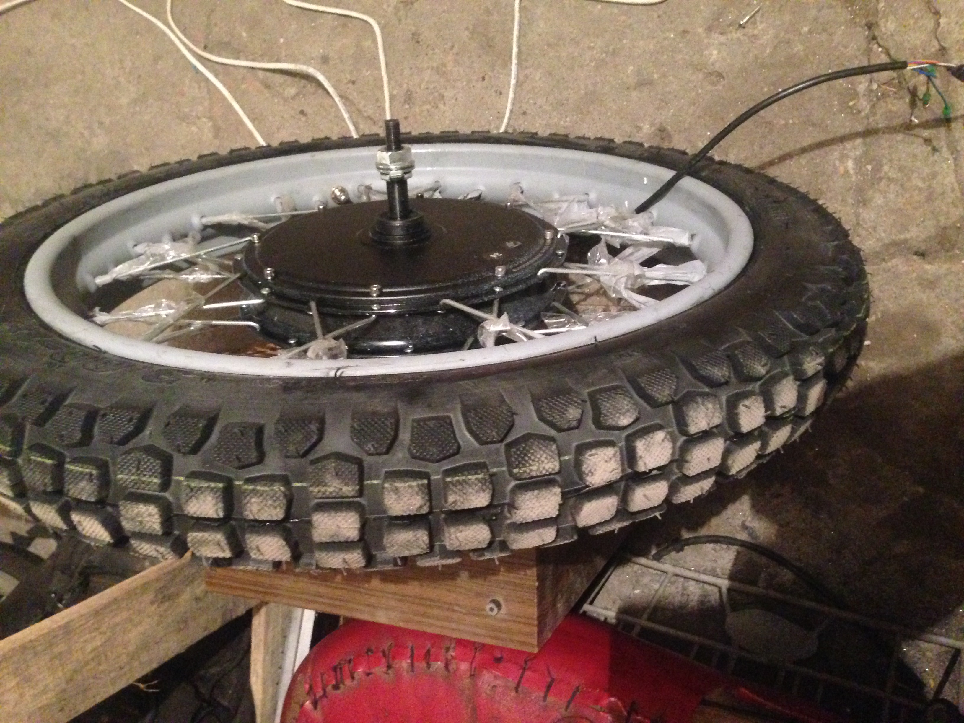 Были приобретены два мото обода R18, два мотора 36v 600w (будет полный привод), контроллеры к ним и ручка газа. Моторы заспицовал в обода, проблем не возникло, купил для пробы хорошую шипованую резину, вид внушительный у колеса). По моторам скажу только одно, пробовал этот мотор на обычном велосипеда, колеса 24" батарея 48v 20ah контроллер 48v 800w скорость уверенная 55км/ч запас хода около полтинника без педалей, считаю очень не плохо...