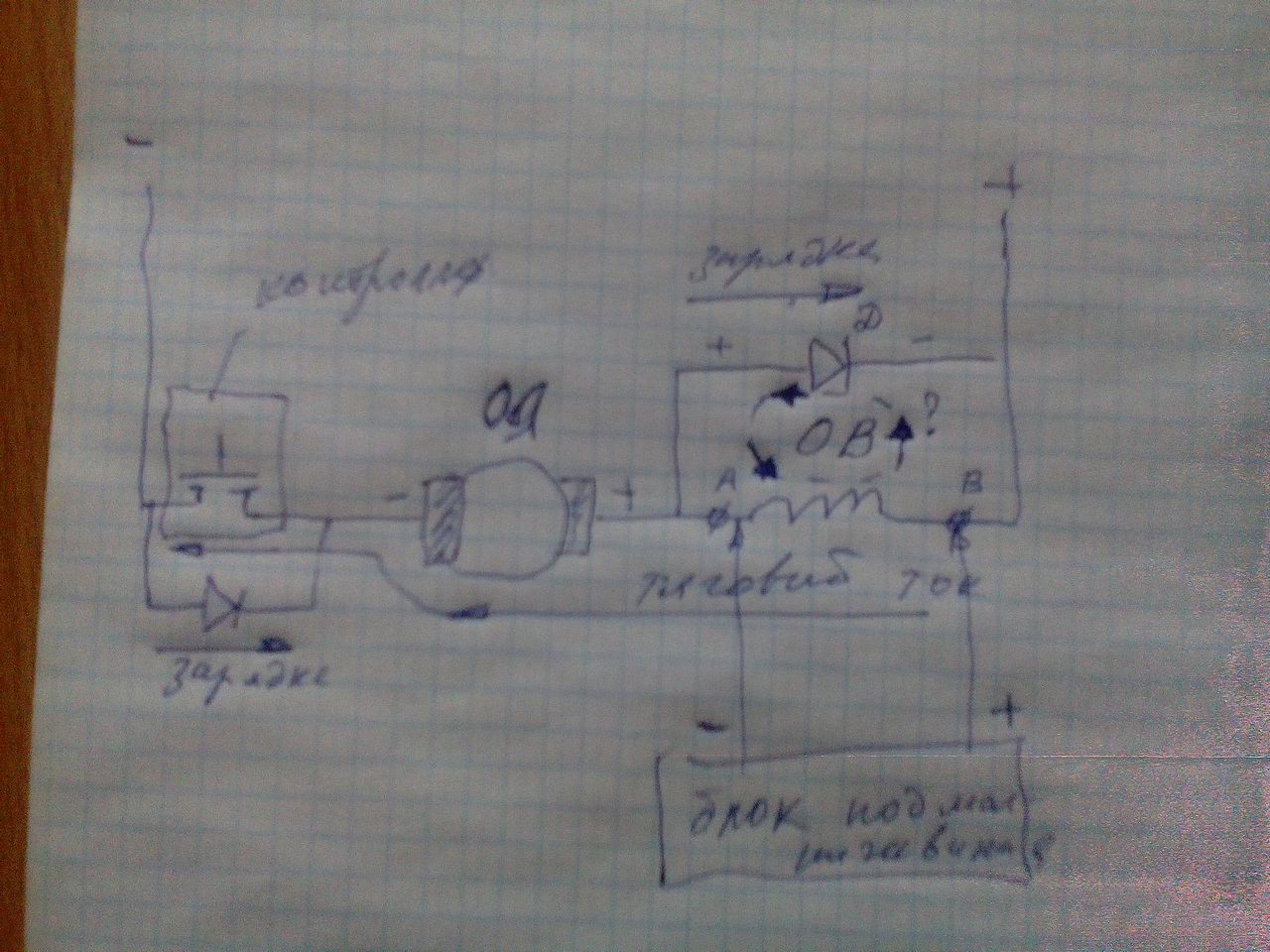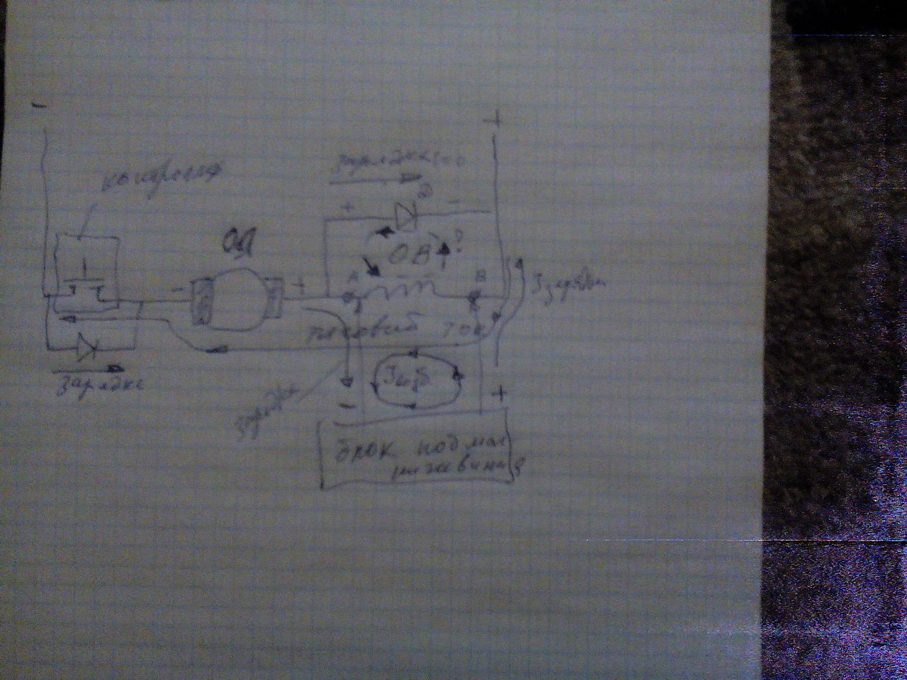 Ещё одна версия,если нет второго диода: ток зарядки пойдёт в блок питания ОВ,ему туда путь открыт,он сложится там с током возбуждения и уйдёт заряжать тяговую (один,без тока возбуждения).Думаю этот блок такого не выдержит и накроется.