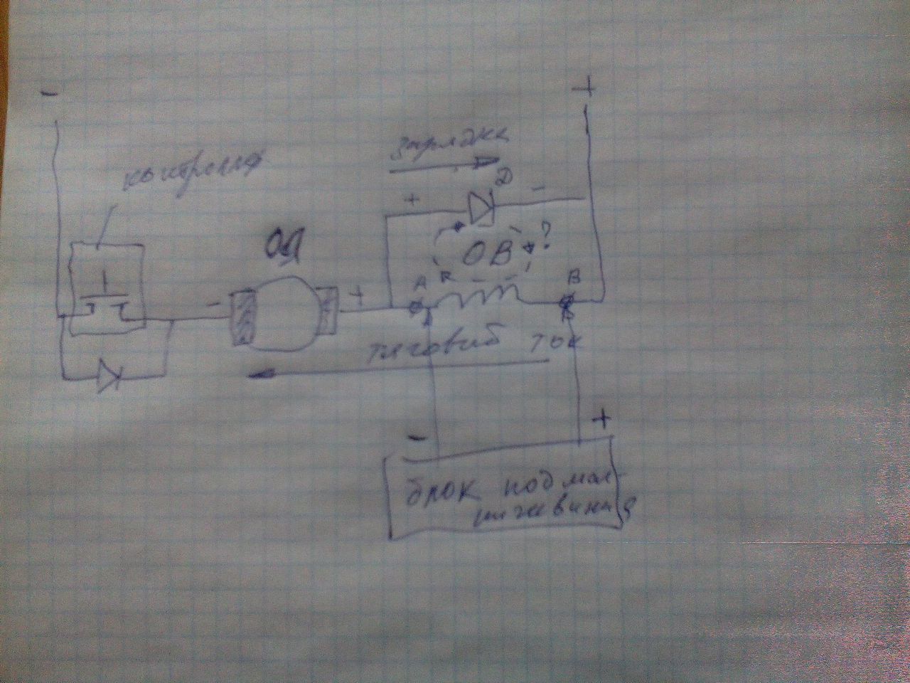 Вправо шунтировать надо обязательно,но часть тока все равно будет идти через ОВ,поэтому ещё последовательно с ОВ один диод,чтоб только тяговый ток пропускал.Иначе у нас ток зарядки будет влиять на ток подмагничивания.