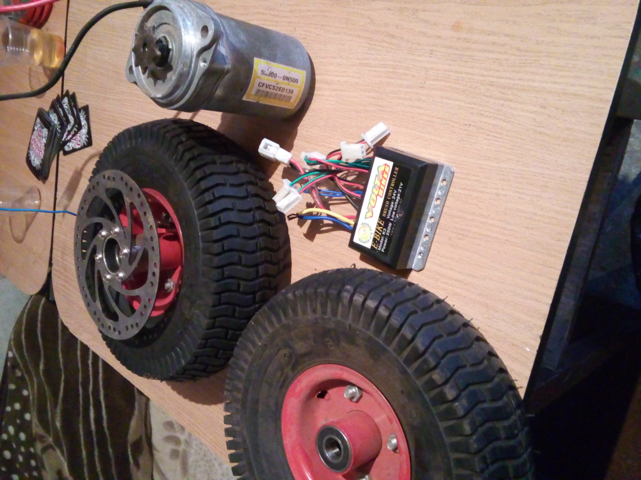 Есть еще вот такой комплектик для самодельного самоката или машинки.Заднее колесо под дисковый тормоз с самодельным фривилом,хорошие дорогие покрышки,контроллер 24в 250Вт,мотор с уже посаженной звездочкой под велоцепь 12в 500Вт с гидроусилителя руля за все хочу 50 баксов.