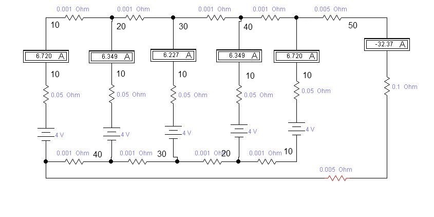 На схеме я цифрами обозначил токи на перемычках, исходя из тока каждой ячейки 10А. Это то, что не бросается в глаза, но на крайних ячейках создается легкий перекос по напряжению исходя из разных токов на верхней и нижней перемычках (на крайних ячейках разница 30А, на средних 10А). В итоге, это и делает разбег по ячейкам.