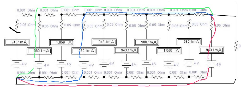 На рисунке по красной и синей цепи течет разный ток (при одинаковом напряжении ячеек). Или мне показалось?