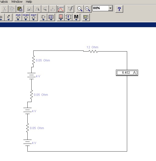 три элемента по 4 В , в сумме 12 В , нагрузка 12 Ом , по идее ток должен быть 1 А.
