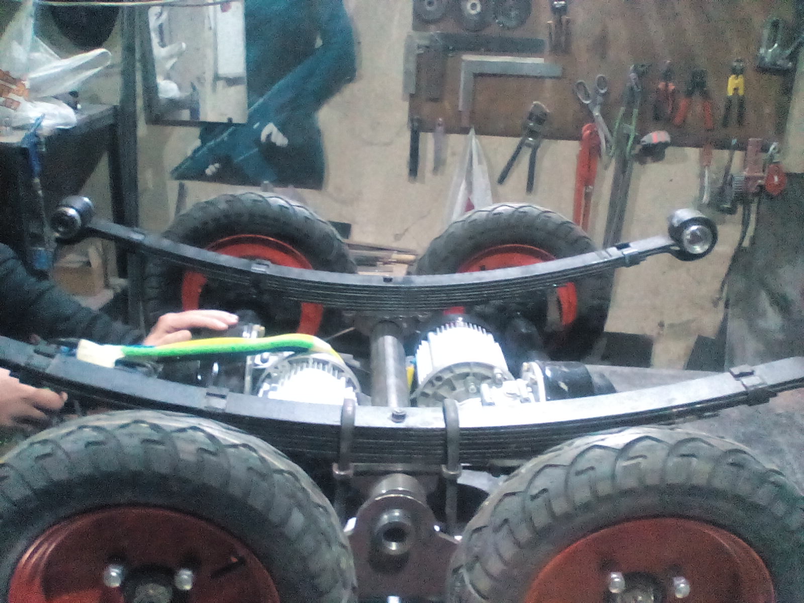 Строим новый поезд, более крупный на двух мостах от Вольты по 2 кВт. Поезд будет состоять из локомотива и двух вагонов длиной по 4400 мм. Ведущие мосты на локомотиве будут объединены в балансирную тележку по типу камазовской. Подвеска локомотива и вагонов рессорная, рессоры от УАЗа.