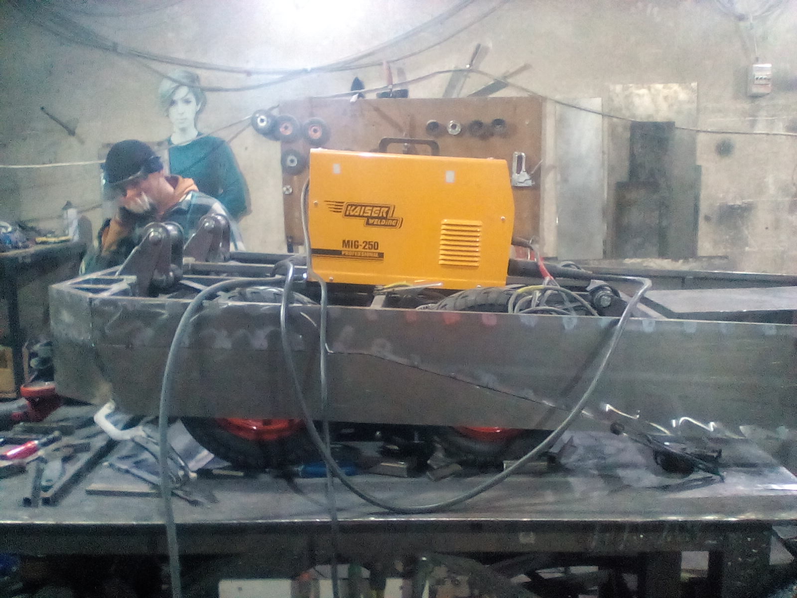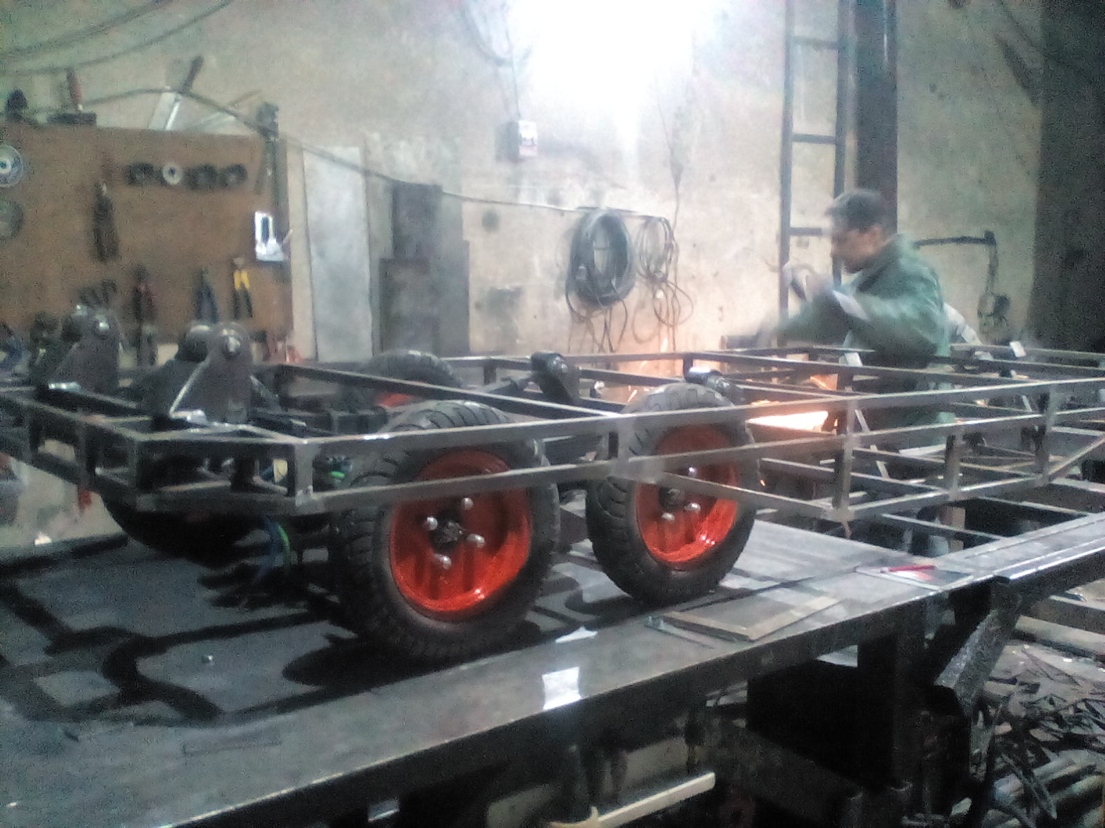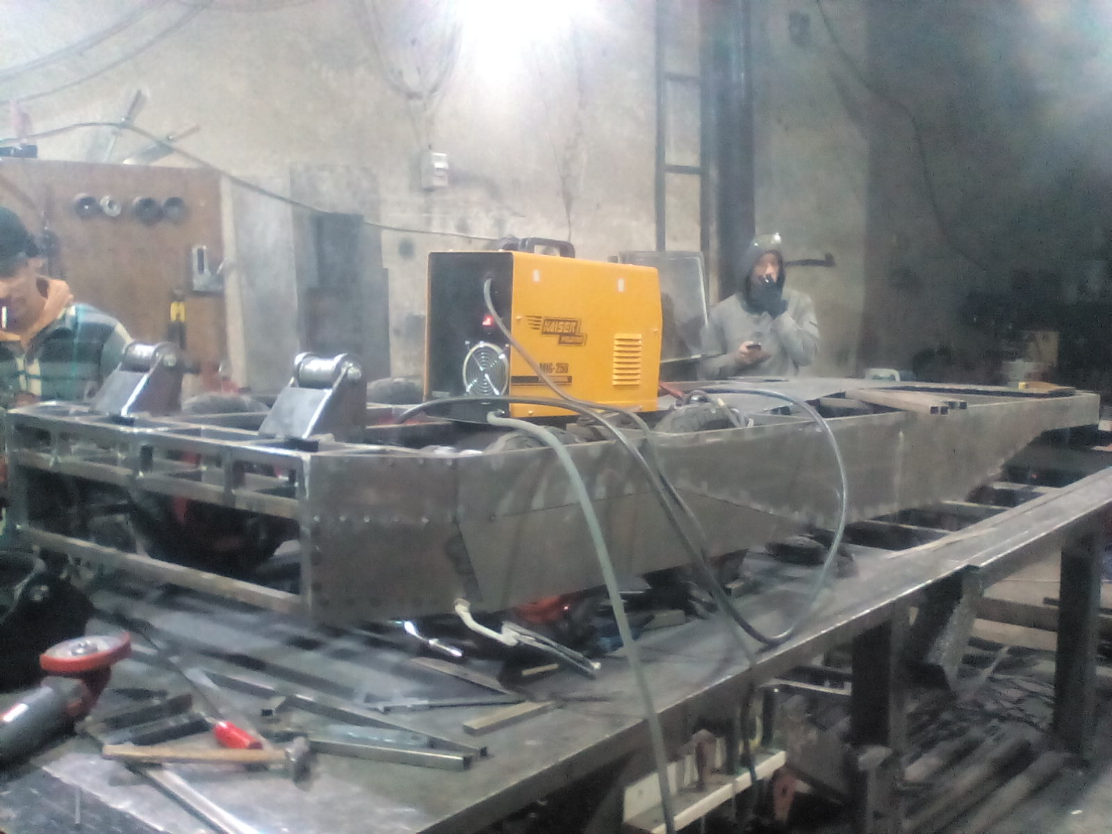 Из профильной трубы 25*25 изготовили раму локомотива длиной 3500 и шириной 1200 мм. Приступили к соединению рамы с задней приводной тележкой: