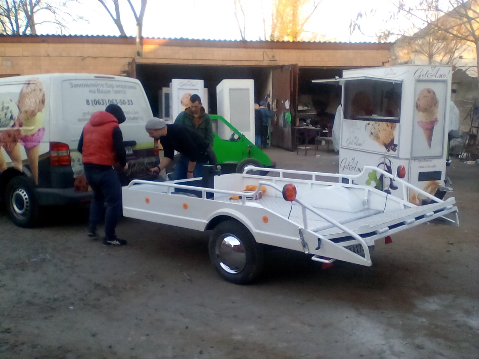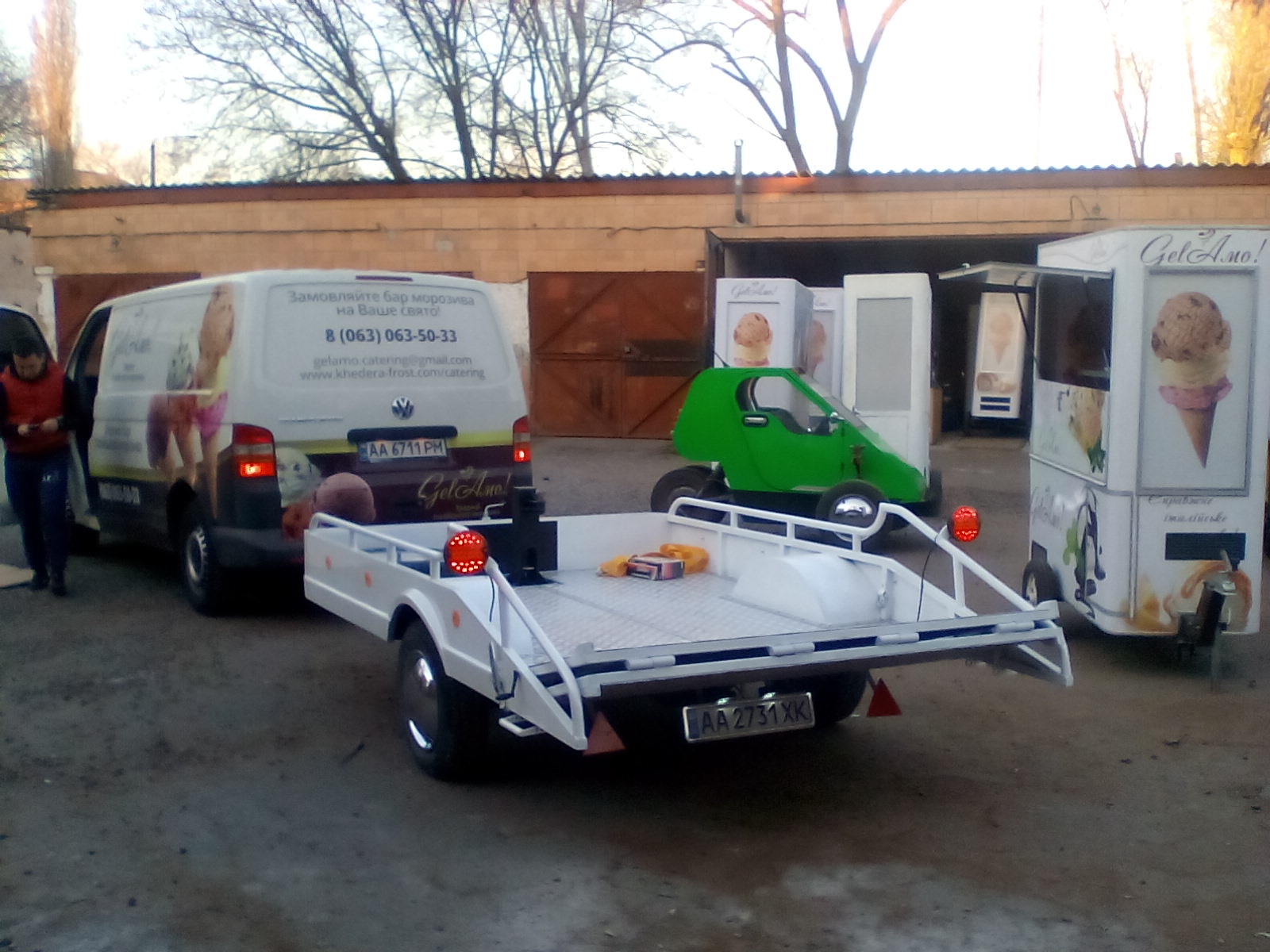 Во вторник едем за моторами для Страйк 2, к сожалению моментных на данное время нет в наличии, поэтому поставим такие же как и на Страйке 1, только их будет три. А пока, Встречайте в Киеве наши передвижные автономные торговые точки по продаже мороженного и специальный прицеп для их перевозки нашего производства. Всего в Киев нами поставлено восемь торговых точек, два самоката-буксировщика и один прицеп для их перевозки.