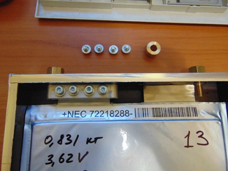 Вот так собираю батарейку. 4 монстра в параллель. Два снизу и два (на фото их нет) будут прикручены сверху на 4 болта М5. Шина алюминий. Болт с внутренней резьбой латунь.