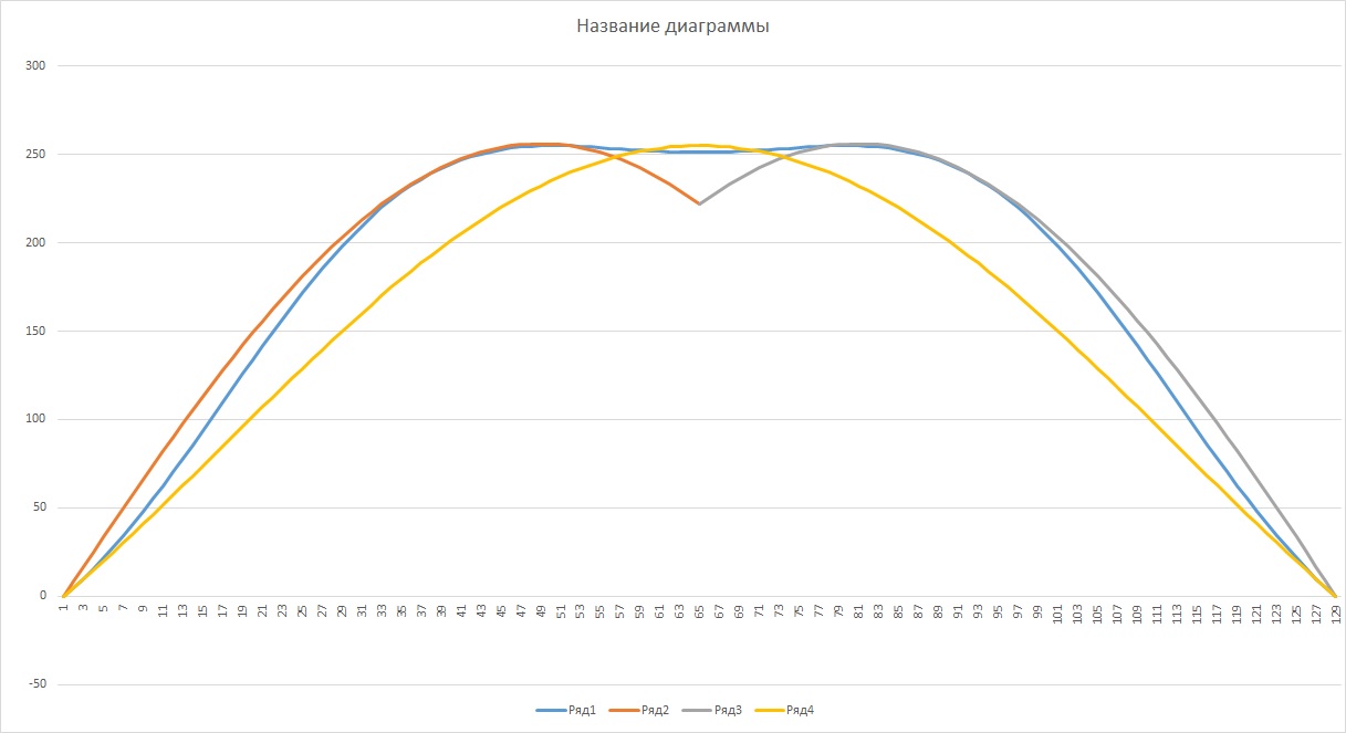 А если ШИМить всеми тремя, то замес с третьей гармоникой дает самое гармоническое изменение заполнения ШИМ (нет острых углов как на осцилограмме полупопий, что должно меньше сказываться на возникновение всяких там помех по питанию, но по факту в обоих случаях нормально работает). В таблице в итоге будет будет эта змешуха синуса с третьей гармоникой, напоминающая сглаженную трапецию.