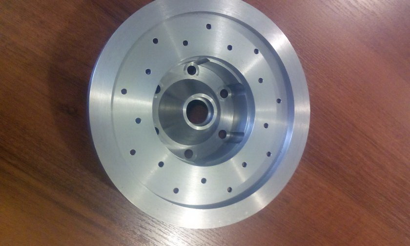 ...процесс,конечно,долгий,но тем не менее приносящий (пока только эстетическое) удовлетворение.Изготовлен маховик - конфигурация специфическая,продиктованная компоновкой всего хозяйства. Порадовало качество и чистота поверхностей и точность в размерах.Больше всего опасался запредельных биений всего "бутерброда" - КВ-промежуточный фланец-роторЭД-маховик,но слава Богу всё сложилось как нельзя удачно. Изначально предполагалось,что вся сборка будет торцеваться в сборе,но как видите эта процедура исключается. Осевое биение на максимальном диаметре маховика меньше 2-х соток,радиальное - около сотки!!! На фото ещё нет чугунной сменной вставки, представляющей собой шлифованное в размер "шайбообразное" изделие,крепящееся в проточке маховика. Таким образом при каждой замене сцепления не будет необходимости торцевать маховик (а со-временем и менять его),а при износе чугунной вставки просто её заменить.
