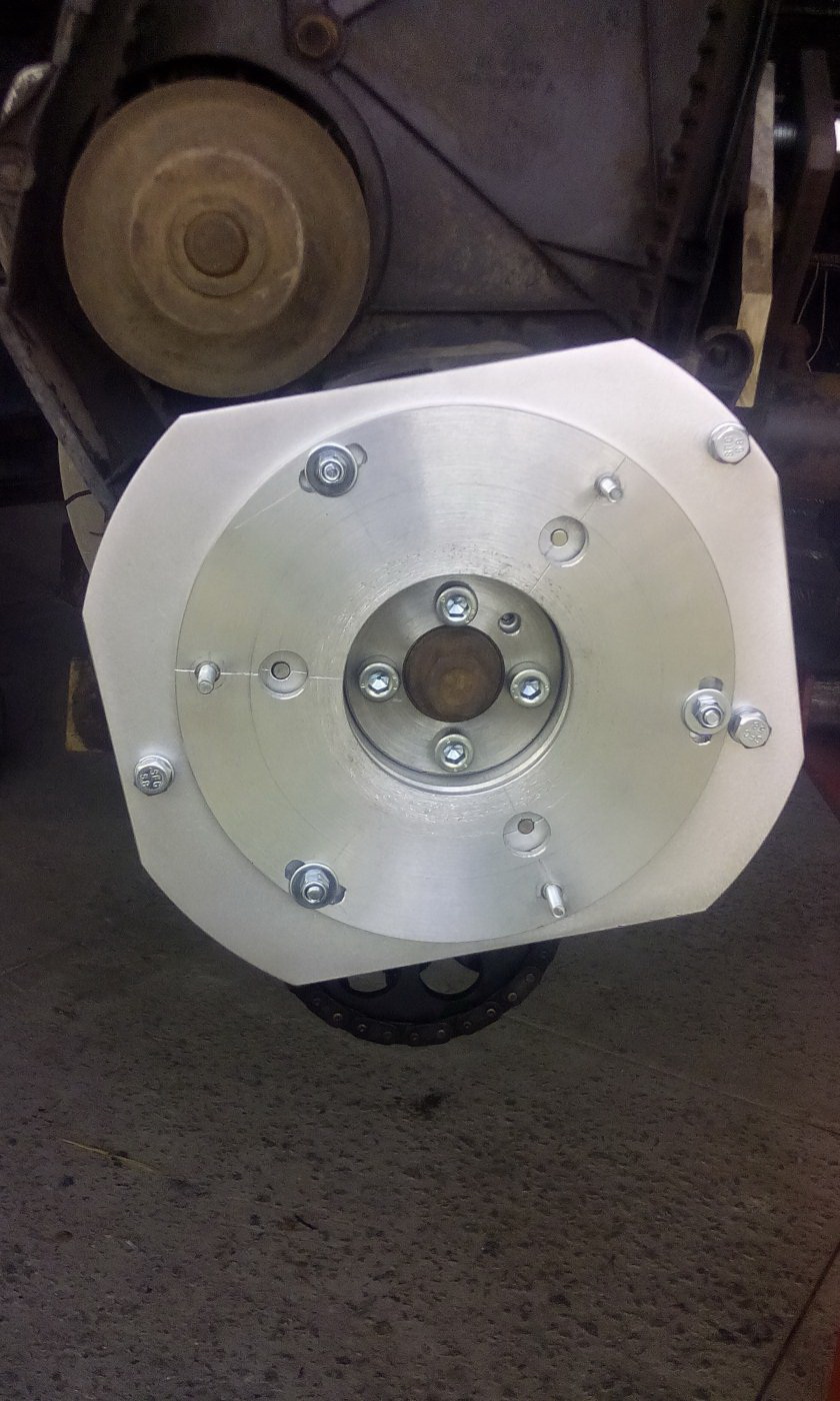 ...параллельно (хоть и о-о-чень небыстро) ведутся сопутствующие работы.А именно - для качественной работы контроллера (он предполагается Келли,синусный - по Гришиной рекомендации) как известно необходимы датчики холла. Располагать их в близости к элементам ЭД я не стал. Т.к. такие атрибуты ДВСа,как стартер и генератор будут отсутствовать,то свою функцию шкив на носке КВ изжил.На его место я и решил установить устройство с датчиками. Новый шкив и кронштейны для датчиков - люминь. Неодимовые магниты (12шт.) цилиндрические 5х5,вклеены в глухие отверстия на шкиве.Основной кронштейн крепится к блоку через шпильки(благо подходящих отверстий на блоке предостаточно).Каждый датчик приклеен к своему "миникронштейну" и может регулироваться в пределах 3-5мм. в диаметре. Соответственно весь диск с датчиками может проворачиваться на неподвижном кронштейне в пределах 10-15град. (шо-то типа опережения :D ) Все элементы конструкции центруются (технологическими втулками) относительно шкива. Датчики ещё не распаяны и не герметизированы. Возможно отдам все алюминиевые элементы на анодирование (не знаю как будут обстоять дела с коррозией).