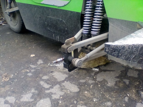 В связи с переходом моторов на Страйк 2 и установкой сюда новых моторов с диаметром 12 дюймов, переводим Страйк на оковские диски и резину. Сегодня сняли колеса и ступицы, ступицы отдали токарю на переделку под три болта, после переделки передка назад будут установлены новые моторы с гидравлическими дисковыми тормозами.