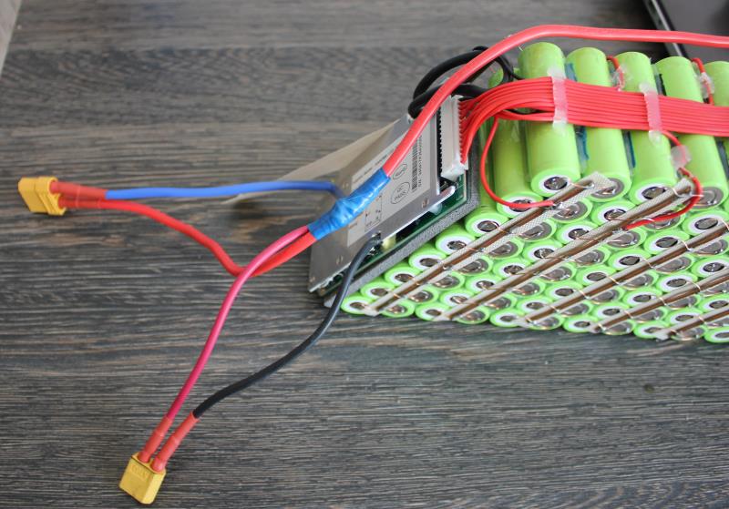 BMS закрепил на 2х сторонний скотч через прокладку их вспененного полиэтилена толщиной 5 мм. Вывел концы сечением 6мм2 c разъемом XT90 для подключения к контролеру и XT60 для зарядки.