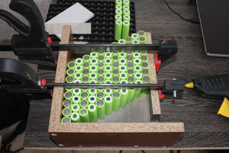 С формой определился. Перед сборкой проверяю напряжение на каждом элементе. Все элементы с одинаковым напряжением 3,888В Собираю шаблон для склейки элементов. Склеиваю элементы термопистолетом с двух сторон.