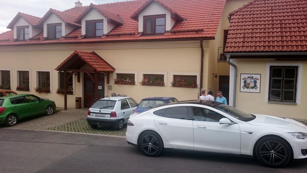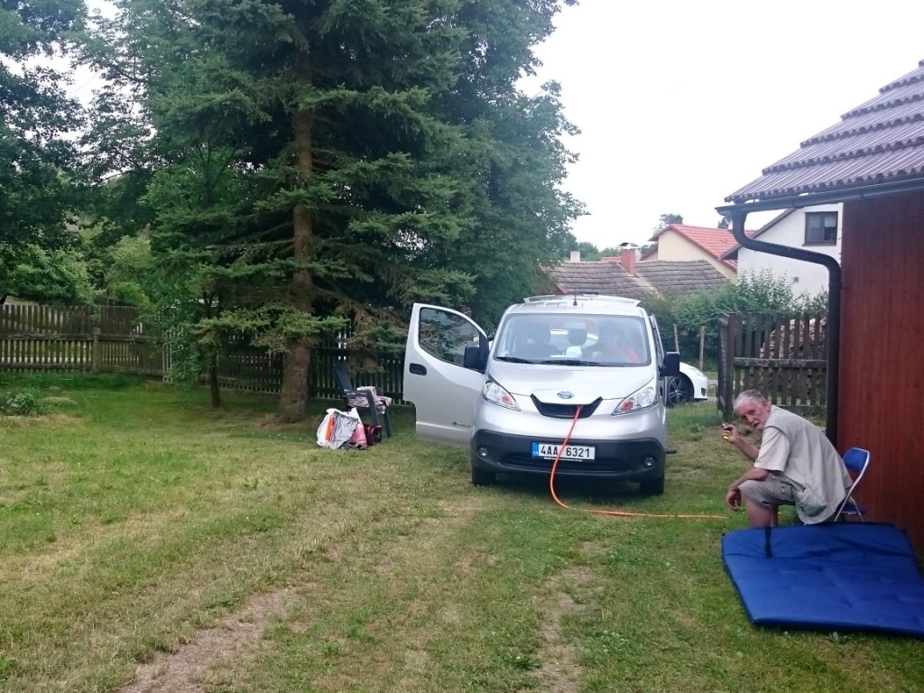 Ближе к полуночи человек 15 из нас во главе с 66-ти летним Яромиром (хотя был с нами коллега и постарше) поехали на традиционное ночное купание . Спать разошлись наверное часа в два ночи . Утром после импровизированного завтрака и чая-кофе народ начал постепенно разъезжаться, но часть из нас выехала ещё на небольшую прогулку . На трёх электромобилях мы поехали в два места проверить новые зарядки. Одна в городке Kamen , который находится на довольно оживлённой дороге , и сам примечателен интересным замком с парками и музеями. Зарядка там прямо у дороги на стоянке перед магазином . Когда мы припарковались перед ней подошла девушка , которая там работает и в её обязанности входит объяснять владельцам обычных автомобилей что не надо парковаться на места перед зарядной станцией- несмотря на все знаки и разметку такие случаи регулярны! Все электромобили были подключены к одному Меннекесу через тройник- каждому по фазе , зарядка выдала 22 кВатта. Интересно что зарядка в этой сети бесплатна , и включается Меннекес просто звонком на указанный там же номер телефона, автоматически. Там же и обычная розетка на 220 , которая подключена постоянно , для велосипедов и скутеров.