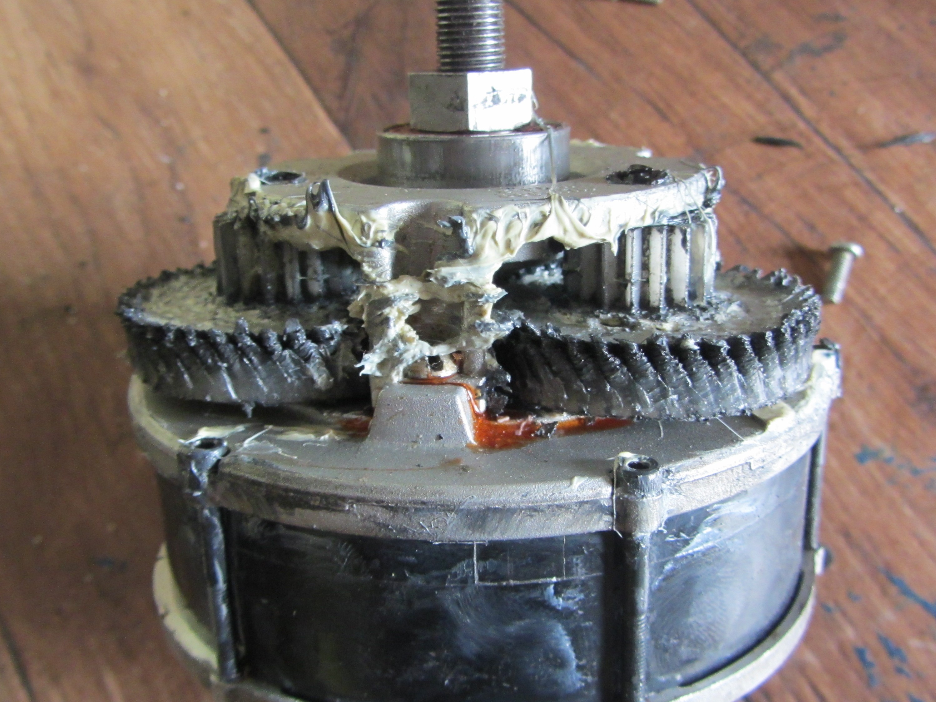 Видел я его на OLX. ИМХО добавить штукарь и купить живой новый редукторник, с нормальными однорядными сателитами, как у меня в двухмоторном конфиге, уже который сезон бегают, я вливаю в них по 750вт (они на 250вт). А у этого может конструктив такой что шестерни летят. Правильная реанимация может выйти дороже. Без обгонной муфты (судя по рекуперации), не удивительно что шестерни подохли.
