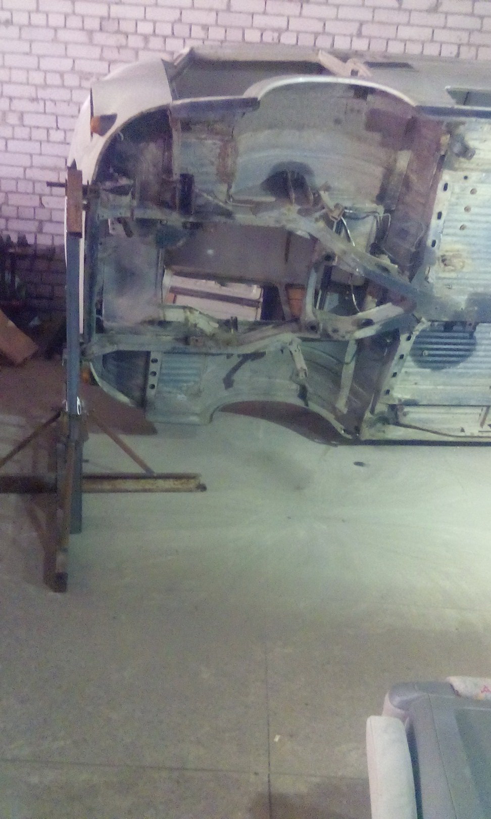 Глобальных продвижений по Баркасу нет,так,рутина... "Железные" работы очень трудоемки и занимают массу времени,но их тоже надо делать. Вот для разнообразия пара-тройка фот - соорудил опрокидыватель для удобства работы с днищем.К тому-же хочу в ближайшее время отвезти машинку (прямо на опрокидывателе,эвакуатором) на пескоструй,шо-б к днищу и нижней части кузова уже не возвращаться.