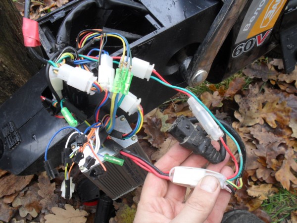 Вилка там действительно муляж.Проводов много лишних с контроллера там потому что должна подключаться сигнализация и освещение с поворотами.Разьемы там нестандартные совершенно.Круиза там скорее всего нет,это что то другое.У меня аппарат немного не такой,двиг 1квт и контроллер 30А.