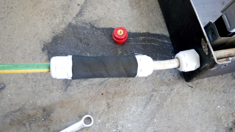 Тут медная шпилька проходит сквозь стальной ящик через второпластовые втулки с шайбами и снаружи входит в обычную монтажную коробку для наружных работ, естественно с применением силикона.