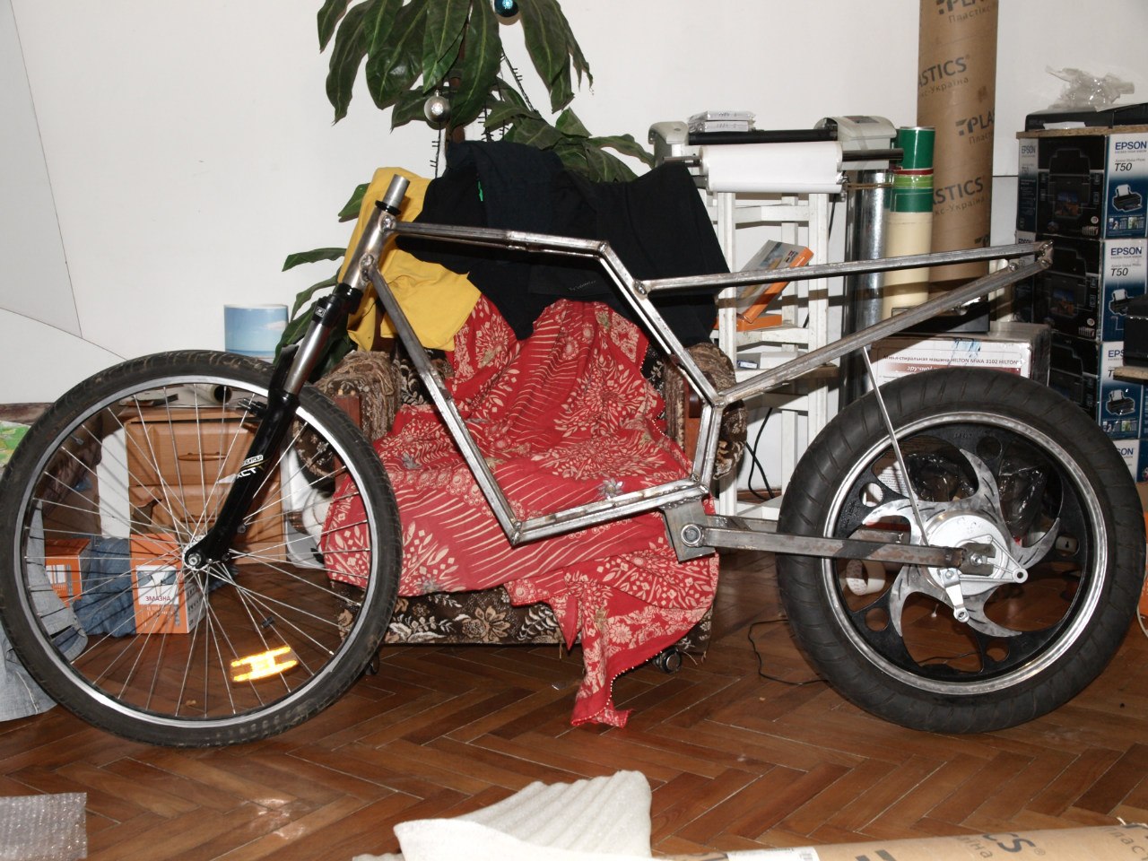 В лютому 2015 року я надумав сконструювати собі центральнопривідний безпедальний транспорт. Почало все як завжди, з примітивного креслення.