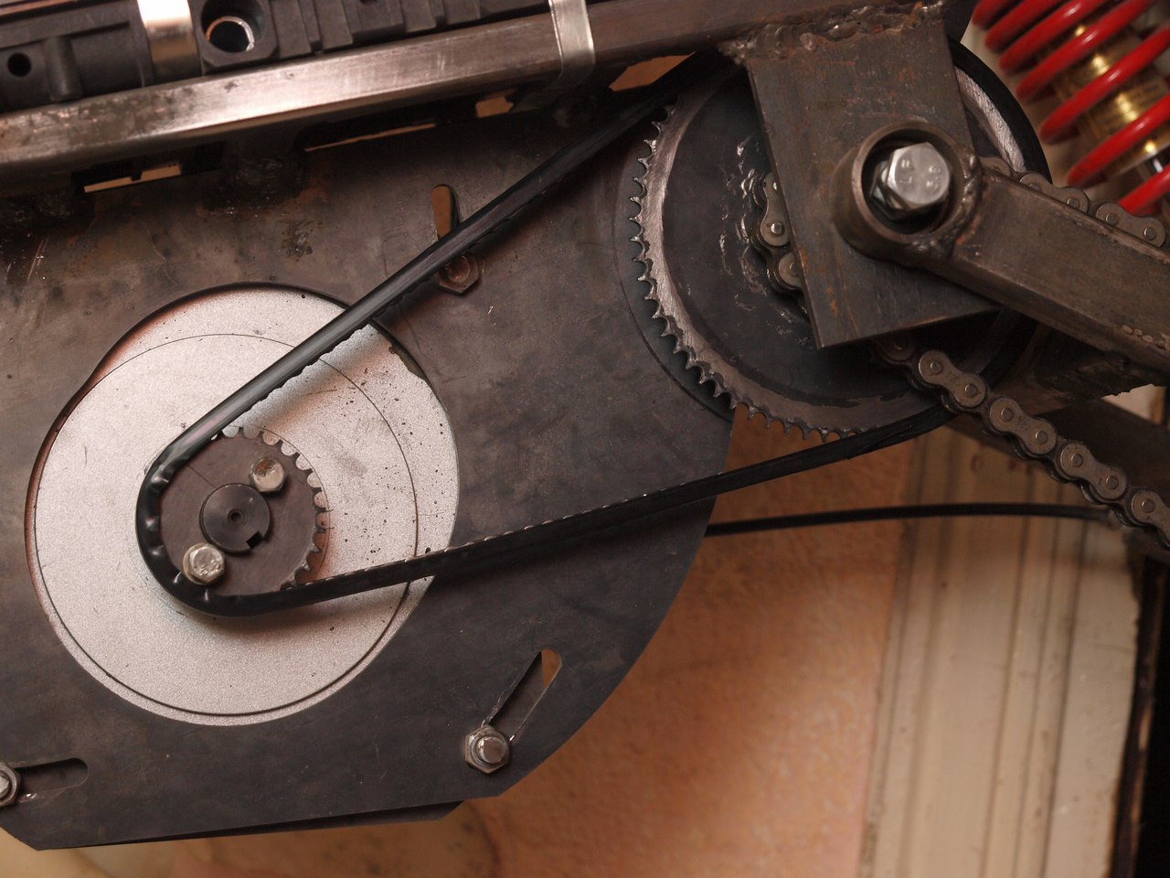 Біда поліклинового ременя, як і всіх гладких - потрібна сильна натяжка для хорошого зчеплення. І коли мокрий - буксував, посвистуючи )) Із існуючих деталей вирішив зварганити ланцюгову передачу першого ступеню.