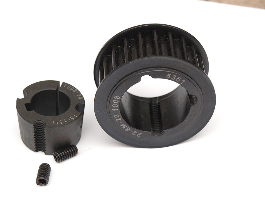Бу придбаний коплект для конверсії: ведучий шків на 22 зуби, перехідна самозажимна конічна втулка "тапербуш" (рекомендую!) та сам ремінь. Профіль HTS 8M 20mm
