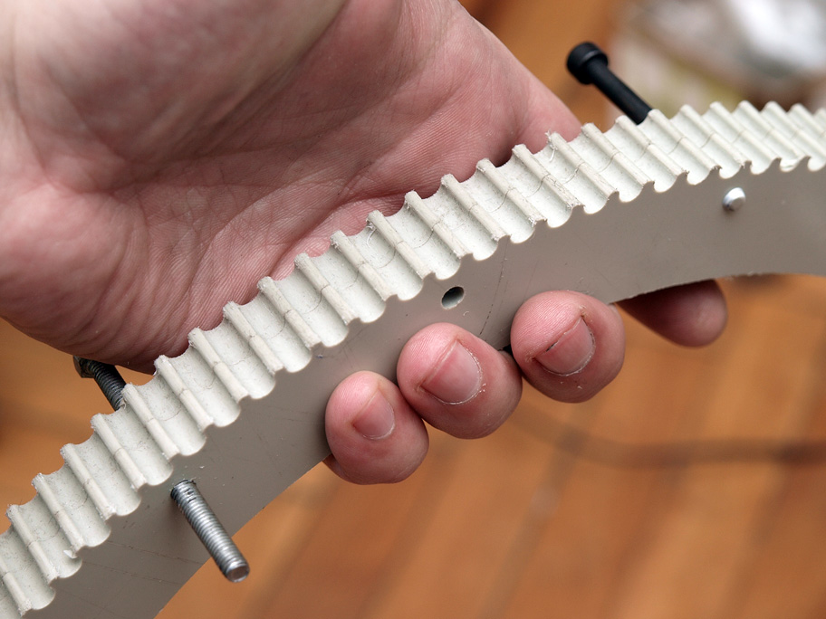 Великий шків вирішив робити композитний. Несуча частина металева, а профіль для ременю з поліпропілену. Шків на 125 зубів. одночасно в зачепленні коло 70. Сила розподіляється рівномірно ) Хоч і малював профіль правильно, беручи інформацію з даташиту, перед виготовленням відповідальної частин все ж вирішив виготовити на ЧПУ оригінал-макет.