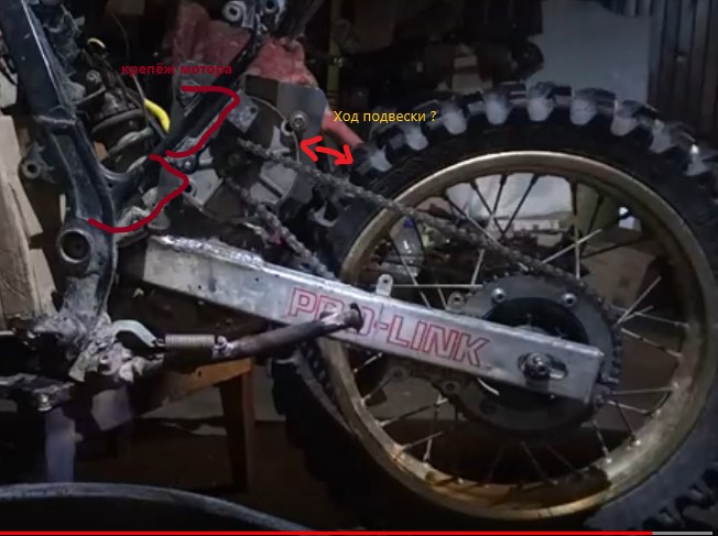 Разрешите поинтересоваться конструкционными особенностями, если я правильно понял по крепежу мотора, мне показалось что как то мало места для отработки подвески (скриншот прикрепил из видео по натяжке цепи).